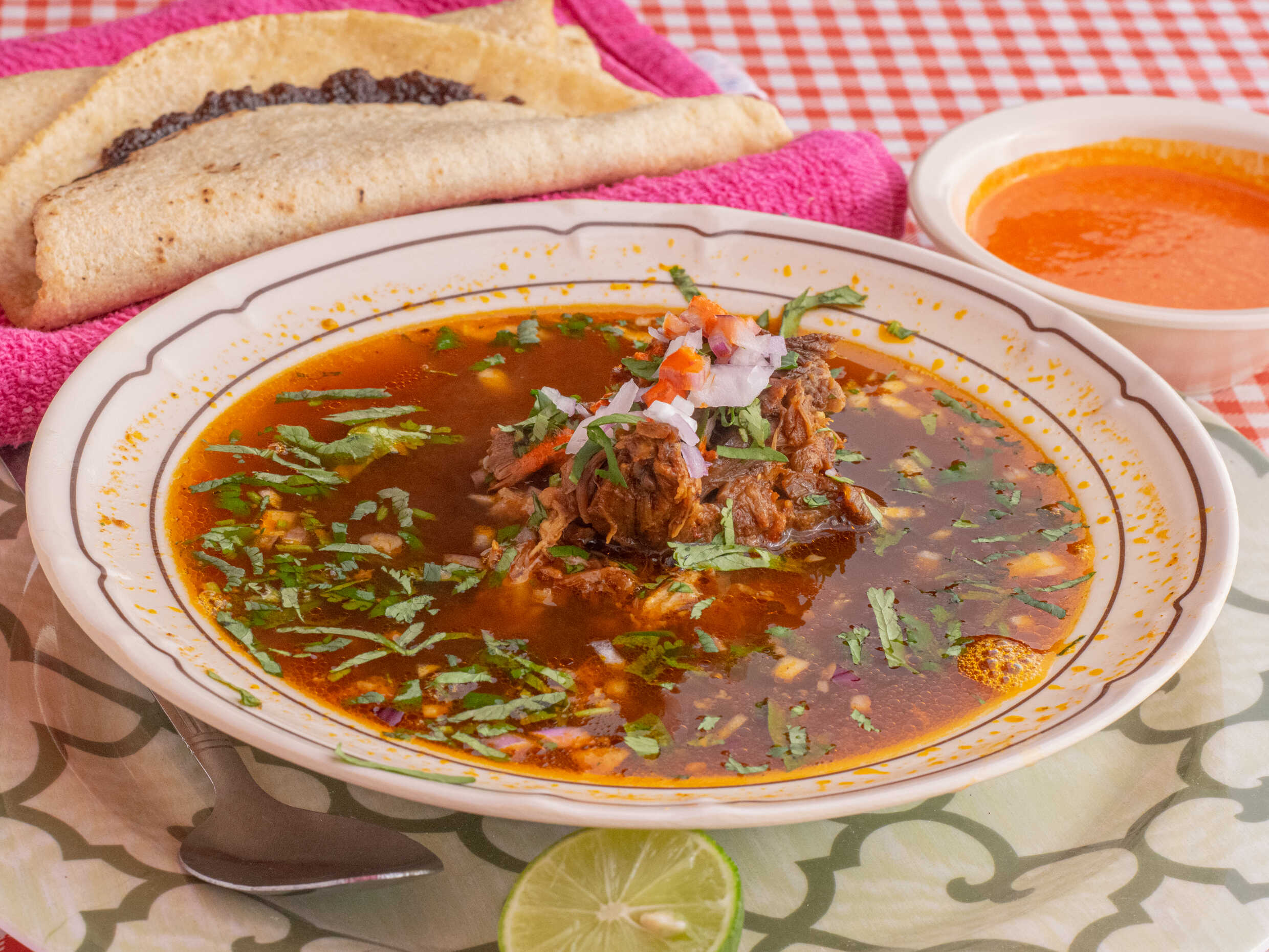 Orden de birria con cebolla, cilantro, salsa, 1 tortilla con asientos y 2 hechas a mano.