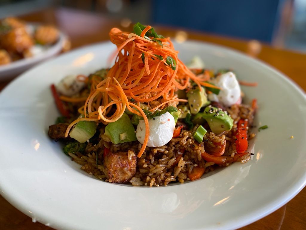 Cama de arroz frito, Tampico, queso Philadelphia y aguacate. Acompañado de pollo empanizado.