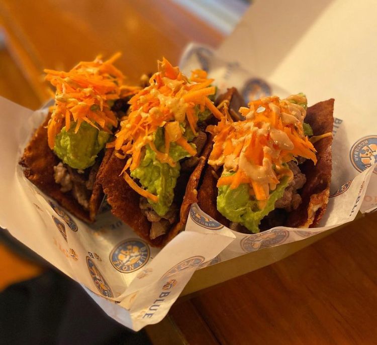 Tortilla de maíz, camarones capeados o rib eye, costra de queso, aguacate y aderezo chipotle.