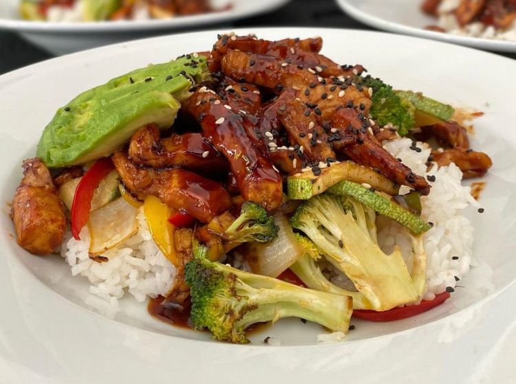Pechuga de pollo con vegetales en salsa teriyaki sobre una cama de arroz blanco.