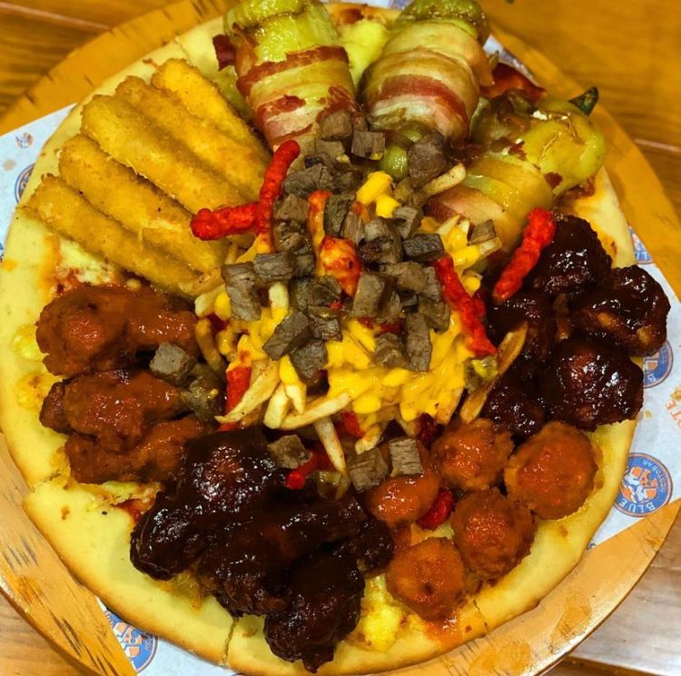 Pizza de pepperoni con boneless BBQ y buffalo, alitas BBQ y buffalo, dedos de queso, chile Caribe rellenos de camarón envuelto en tocino, papas a la Francesa, cheetos flamin hot y carne asada bañada en queso cheddar.