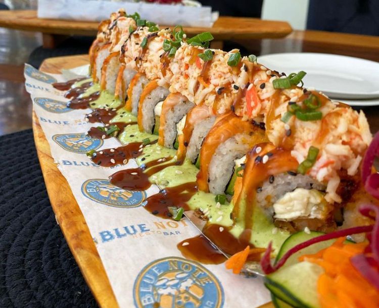 Por dentro aguacate, queso Philadelphia y camarón, por fuera, láminas de salmón con aderezo spicy y ensalada Tampico.