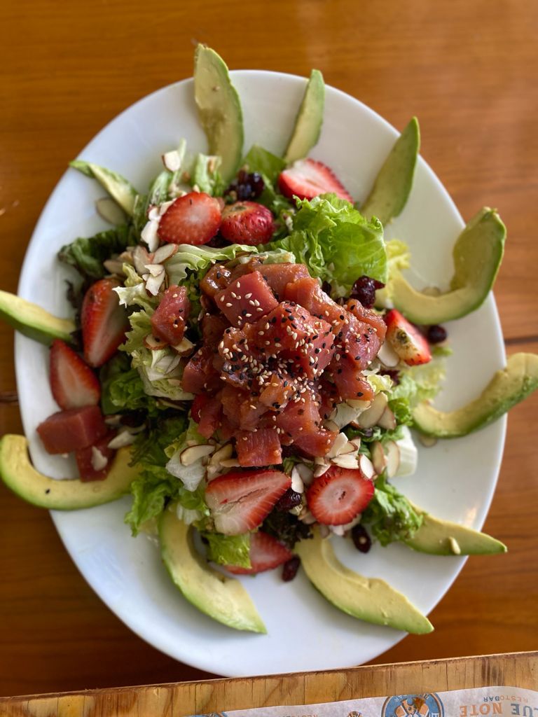 Pepino, cebolla morada, mango, aguacate y un toque de picante.