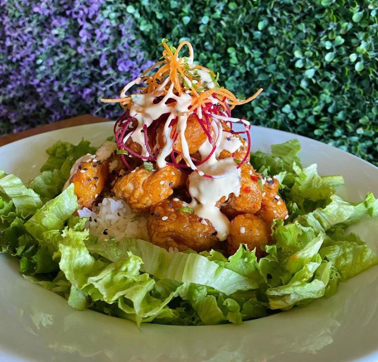 Cama de lechuga, domo de arroz blanco, camarones sazonados y empanizados. Bañado en aderezo spicy y cebollín.