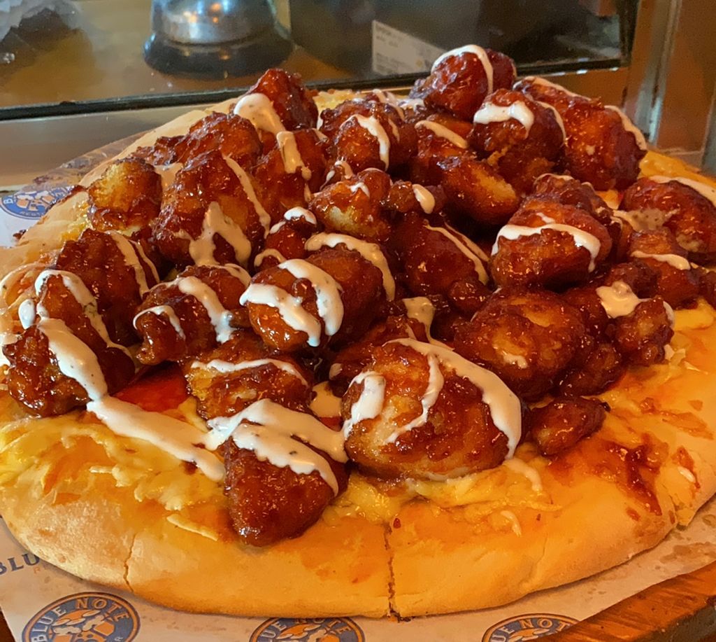 Boneless de pechuga de pollo en salsa buffalo o BBQ sobre una pizza de pepperoni.