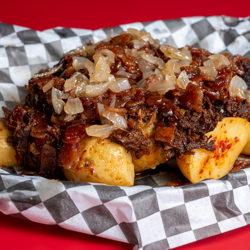 Base de papas cambray horneadas a la mantequilla con especias y chile quebrado con una cobertura de jugoza carne Pulled Pork escarchada con tocino y cebolla caramelizada acompañada del aderezo de su preferencia. BBQ, HOT BBQ o Mango Habanero.