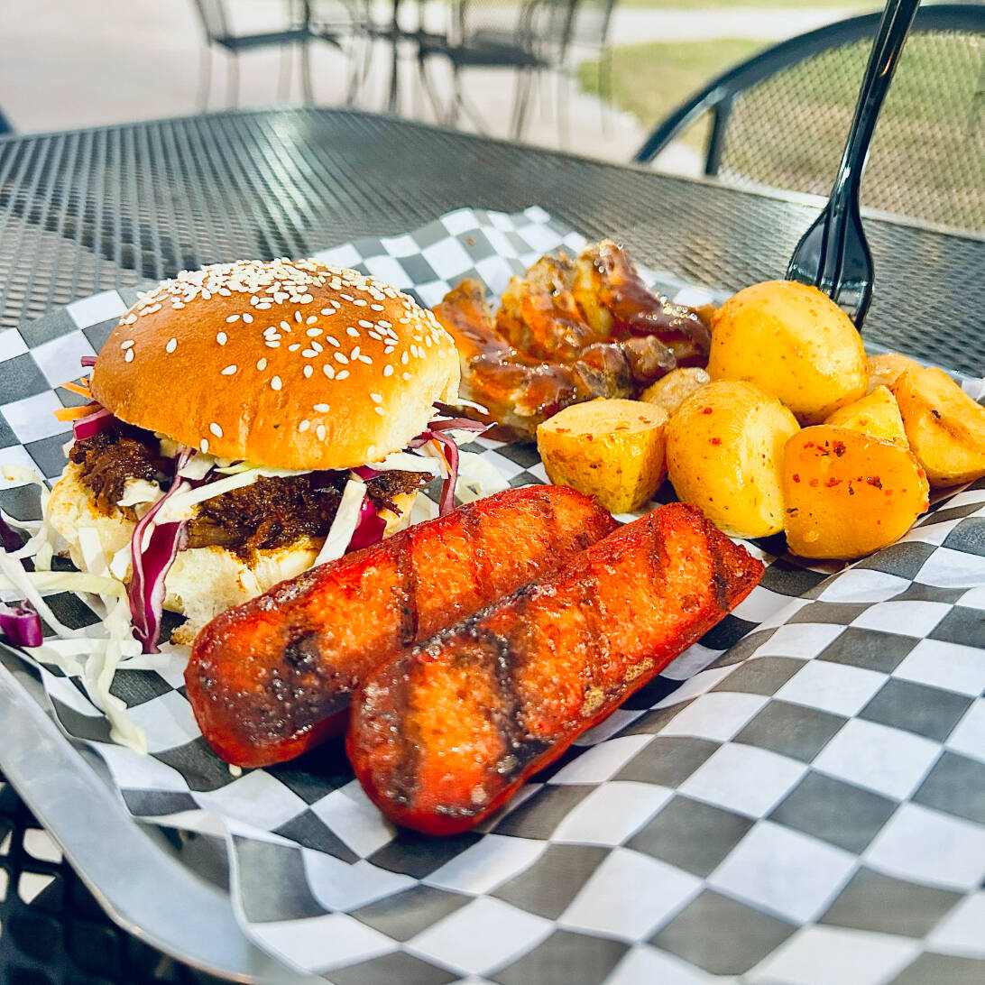 1 Buerguercita/Slider - 3 costillitas - 1 salchicha parrillera y orden de papas veneno o a la francesa