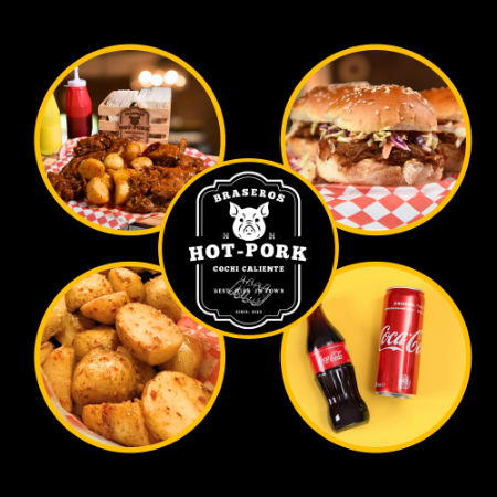 2 burguercitas/Sliders Pulled Pork - 1/2 Full Rack - 1 Orden de papas - 1/2 centro botanero - 2 bebidas a elegir Refresco 600ml o Te