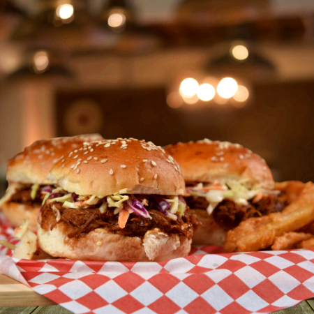 Orden de 3 hamburguesas Pulled Pork receta especial, acompañada de ensalada de col y aderezo de la casa. puedes elegir tres sabores. BBQ, Hot BBQ o Mango Habanero + Papas fritas o Veneno Hechas a la mantequilla con especias y chile quebrado.