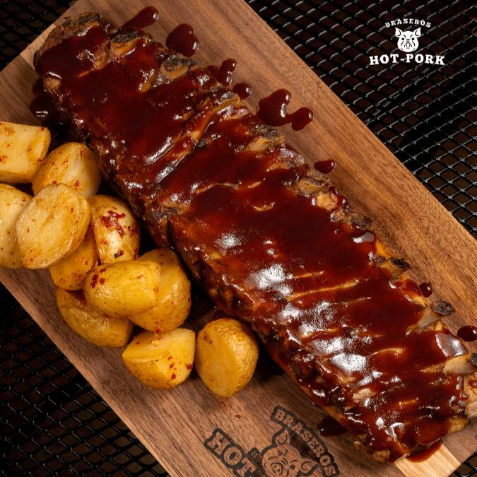 Costillar 600gr cocinado a la brasas previamente marinado en nuestra salsa secreta por 24h acompañado por una orden de papas fritas o papas Veneno hechas a la mantequilla con especias y chile de árbol.
