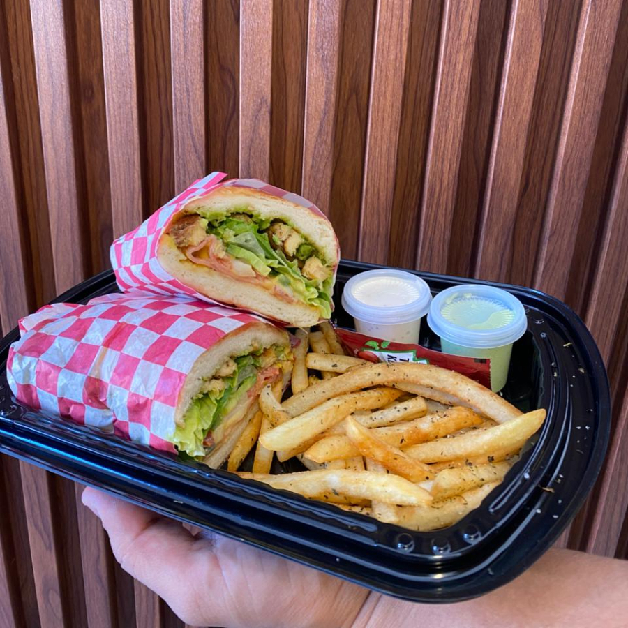 Pan panini, jamon, queso americano, queso manchego, lechuga, tomate, pepino, cebolla, chile y aguacate. Incluye papas.