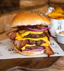 Hamburguesa de 100 gramos triple carne y triple queso acompañado con vegetales y salsas.