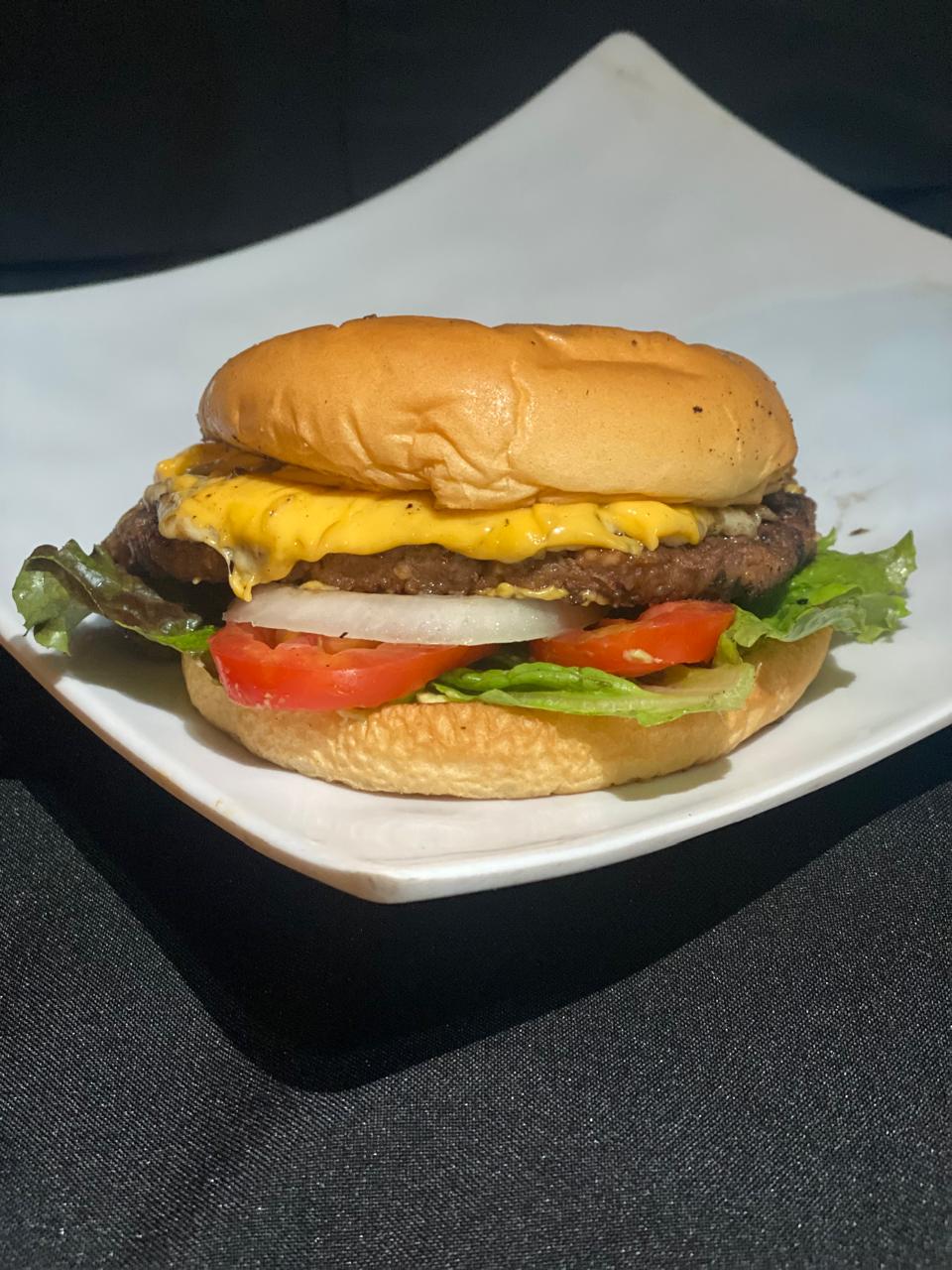 Hamburguesa sencilla de 100 gramos y queso acompañado de vegetales y salsa.