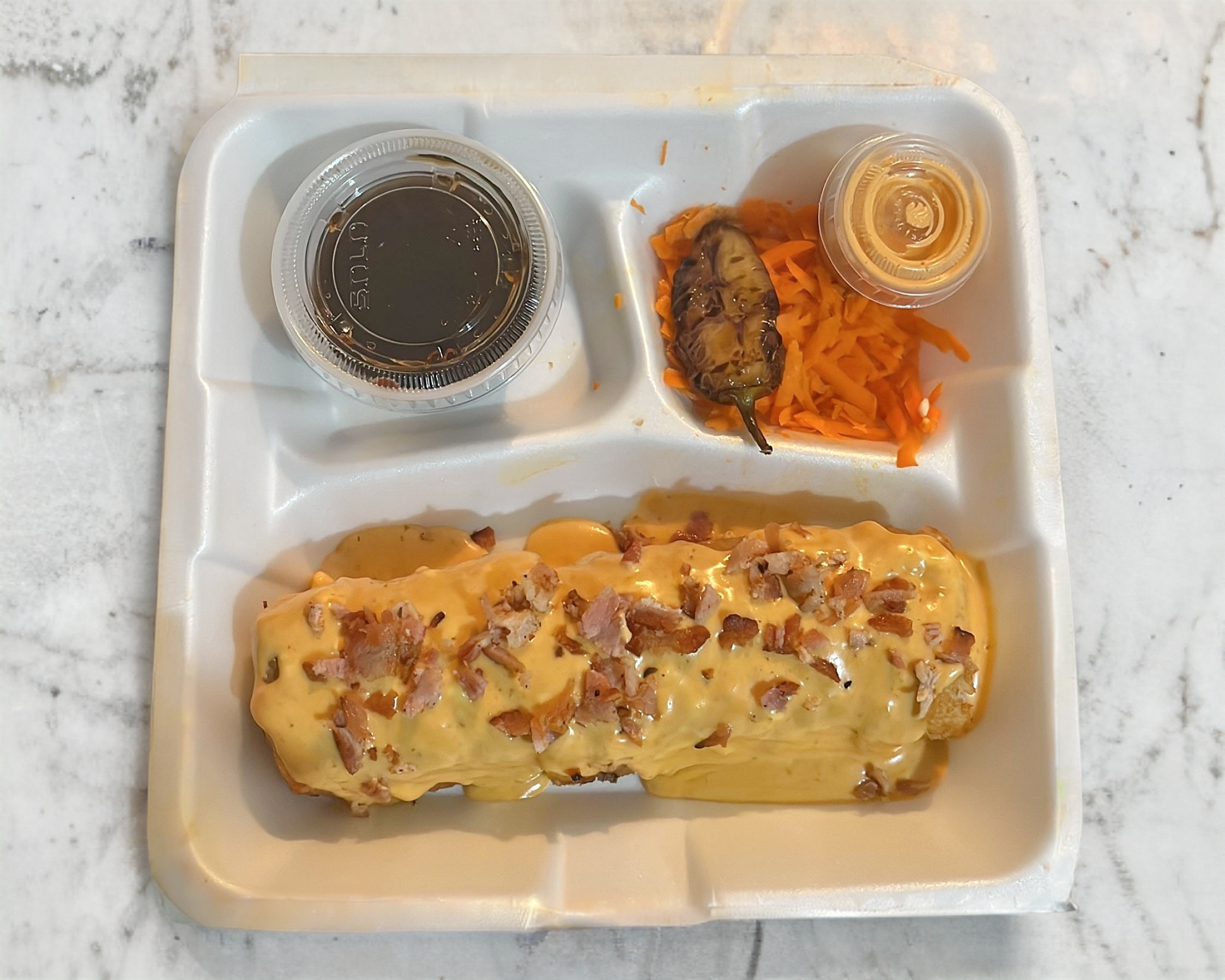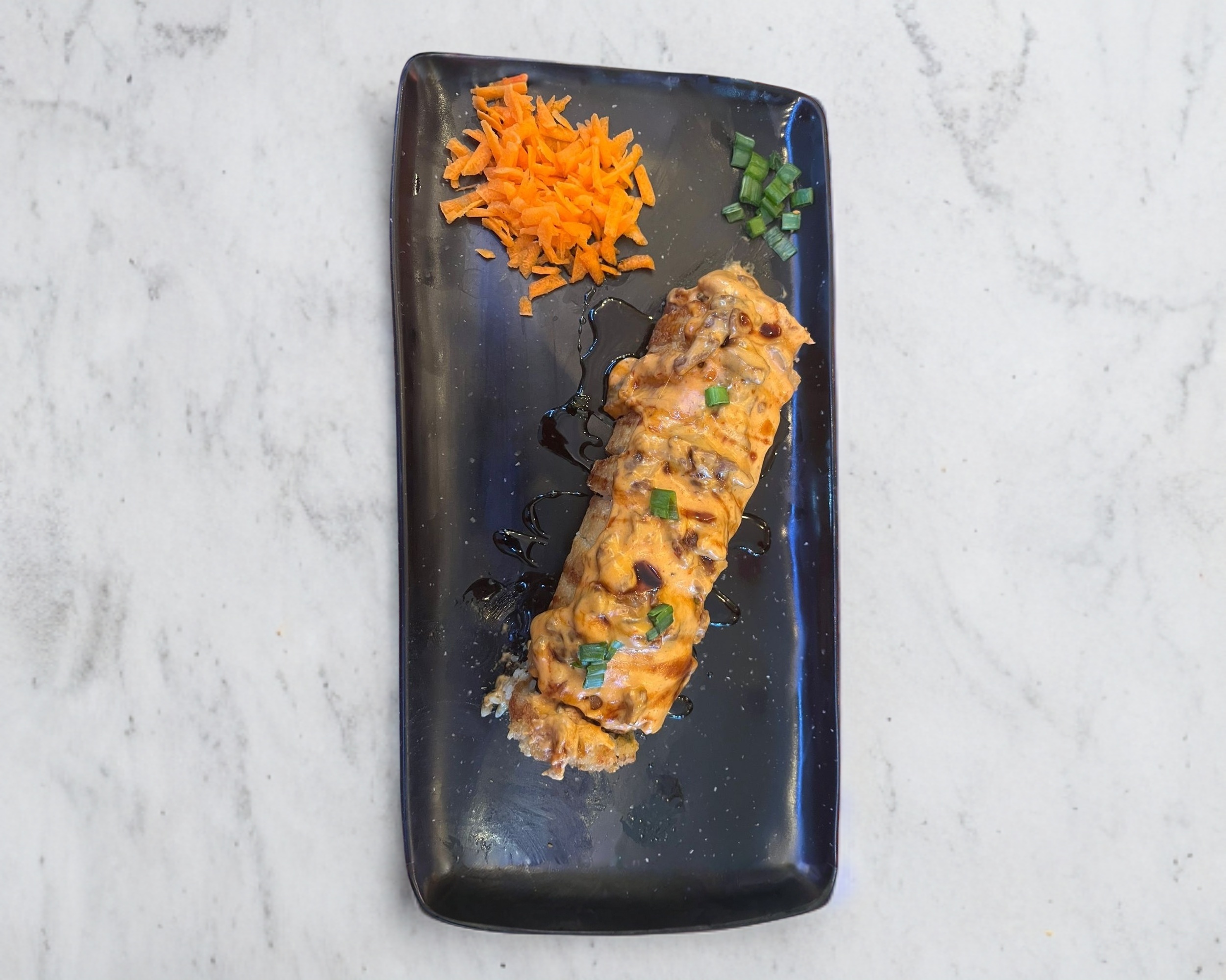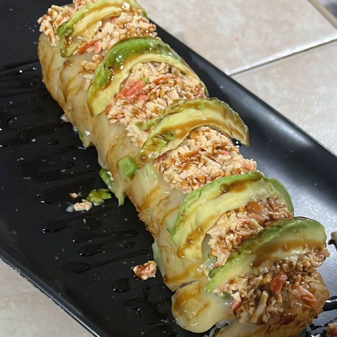 Rollo empanizado con Philadelphia, pepino, aguacate y res; gratinado con spicy chipotle y topping de tocino.