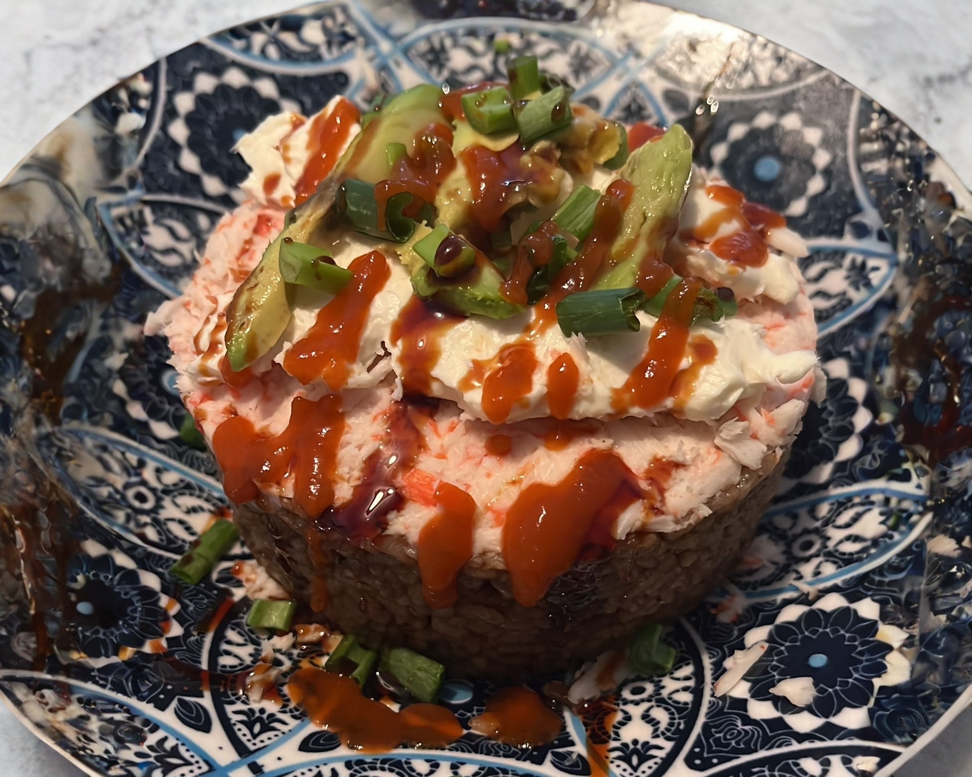 Arroz frito con tampico, aguacate, Philadelphia, bañado en salsa de anguila.