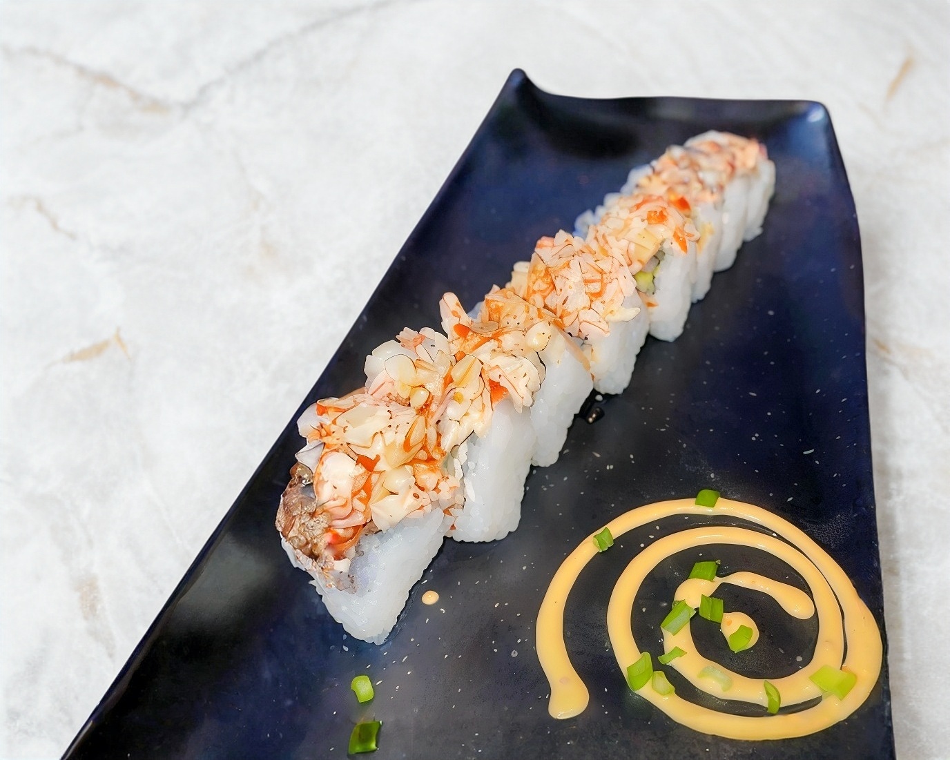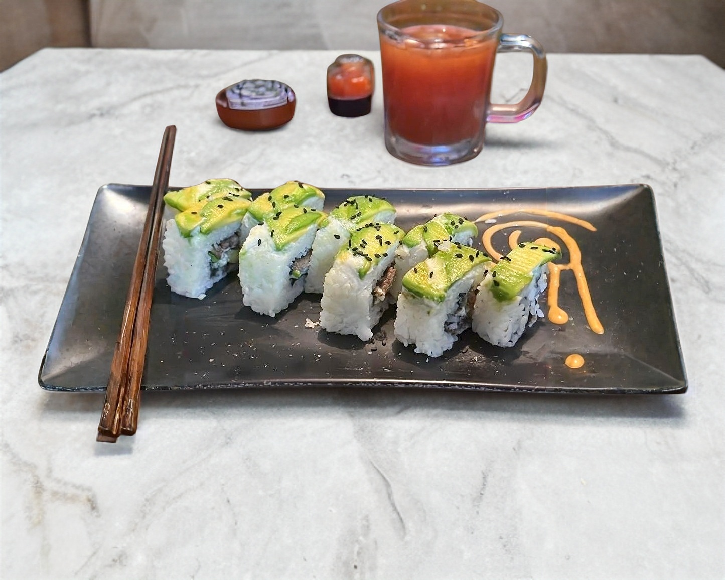 Rollo natural con Philadelphia, pepino, aguacate, alga, surimi; coronado con tampico y salsa de anguila.