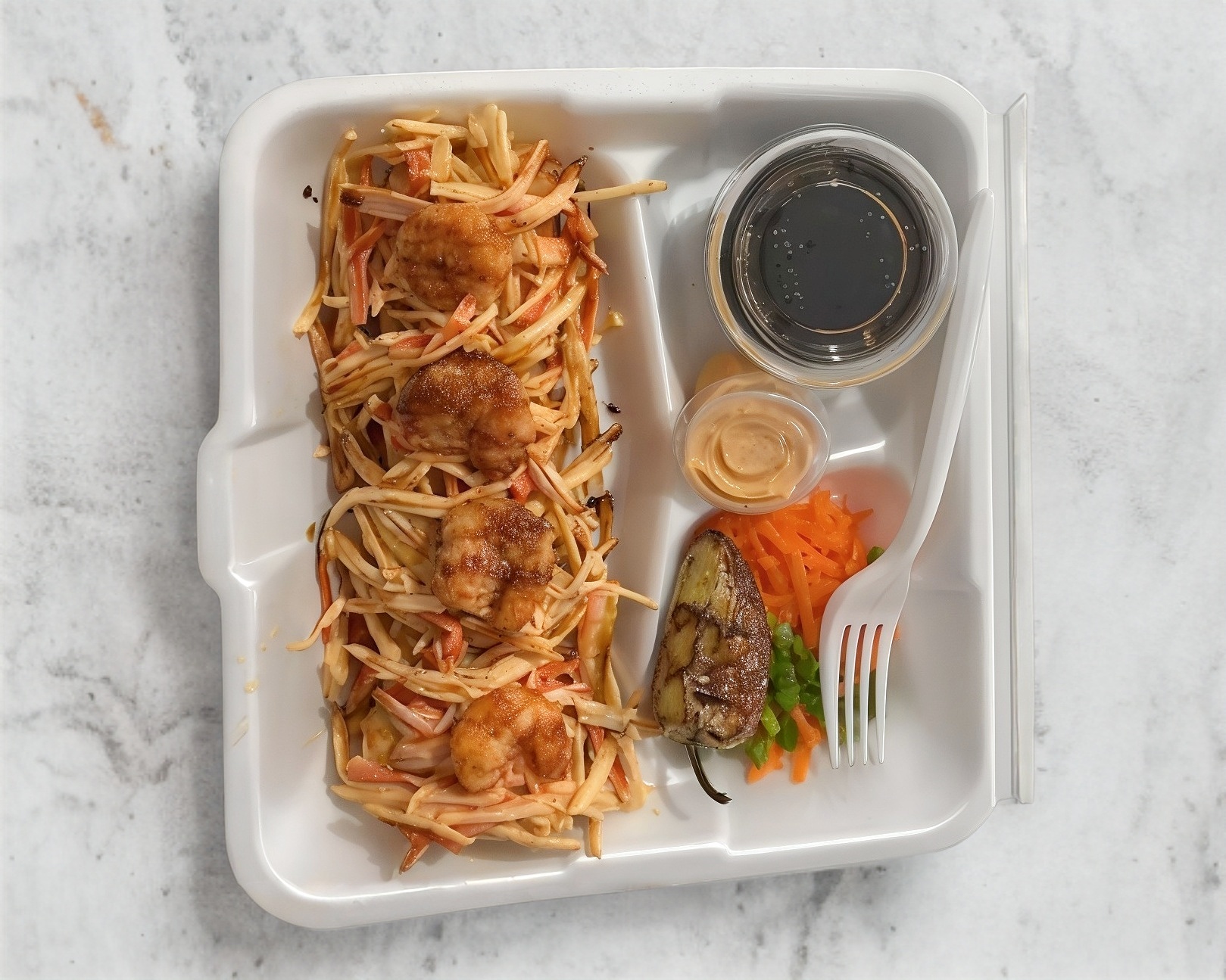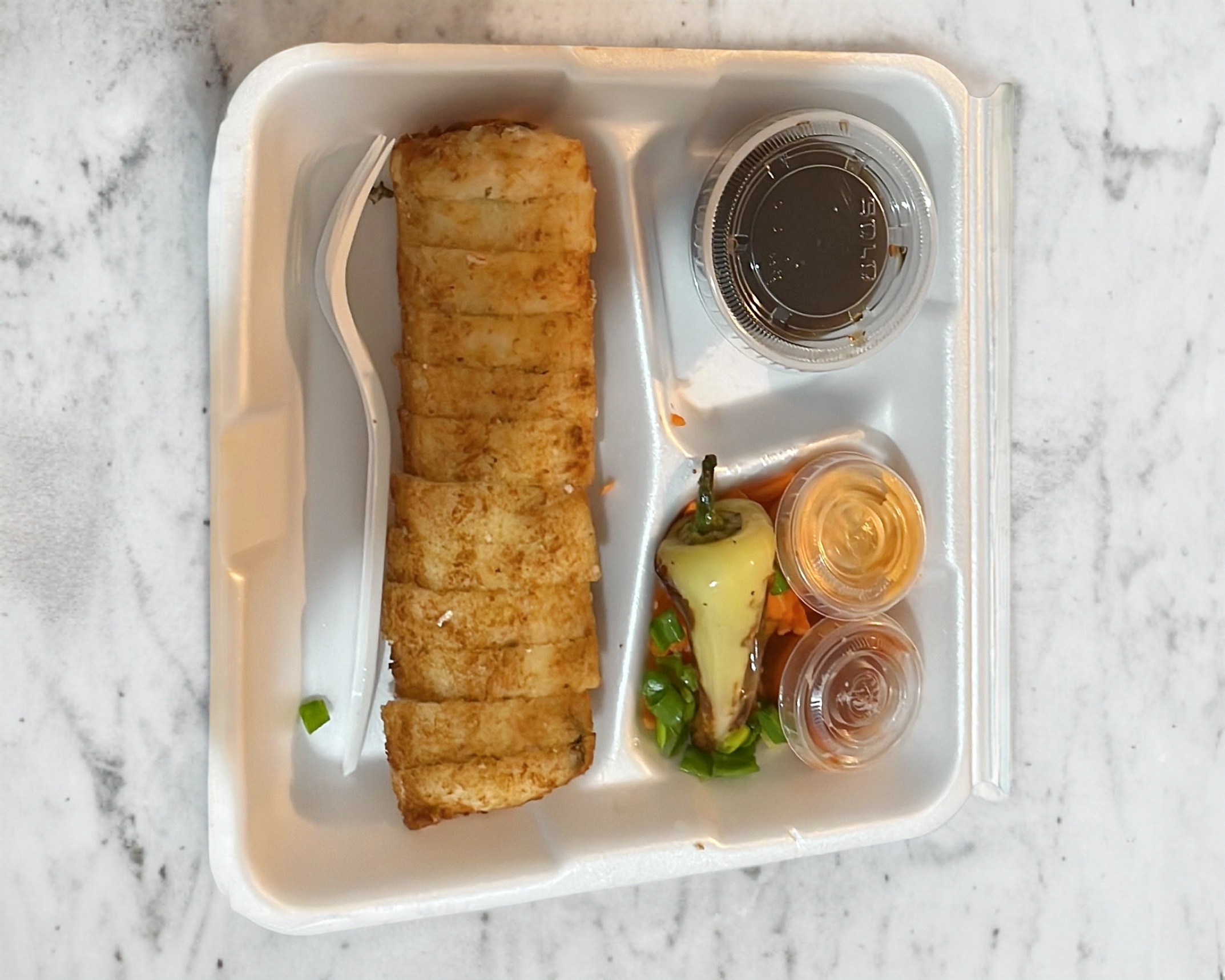 Medio sushi mar y tierra, por dentro lleva camarón, res, pepino, aguacate, Philadelphia y va empanizado, lleva papas a la francesa y boneless, acompañado de ranch, a derecho chipotle, tiras de zanahoria y pepino.