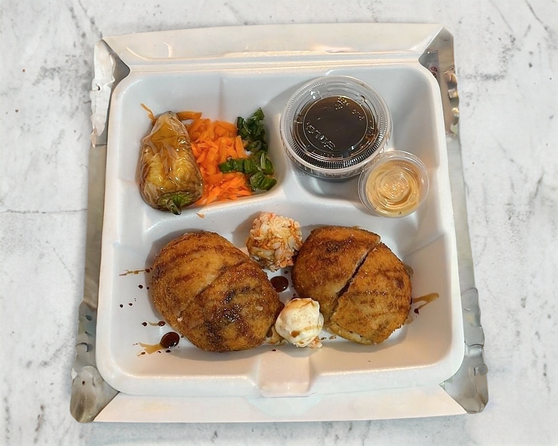 Bola de arroz empanizado rellena de Philadelphia, pepino, tampico, res y camarón.