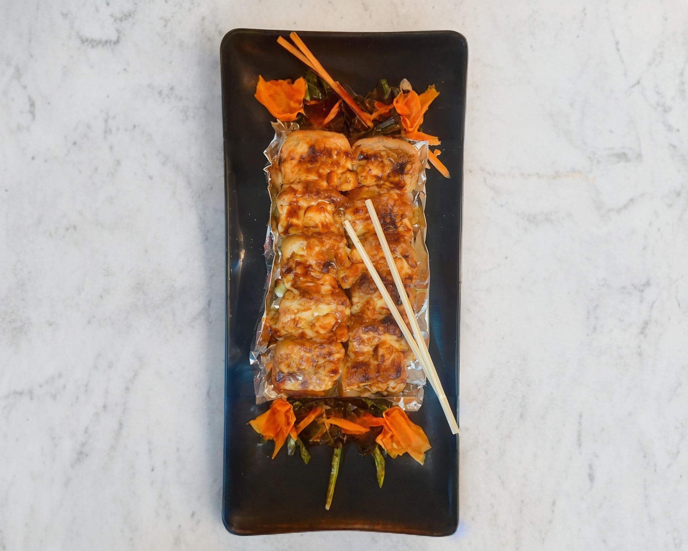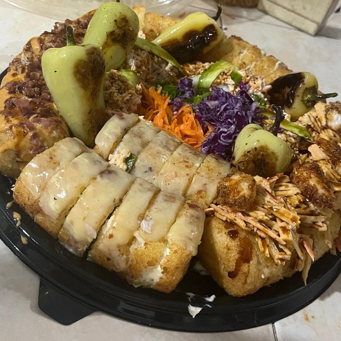 Rollo empanizado por dentro lleva pollo, tocino, Philadelphia, aguacate, pepino, alga. Por fuera va coronado con tocino y res gratinado con spice.