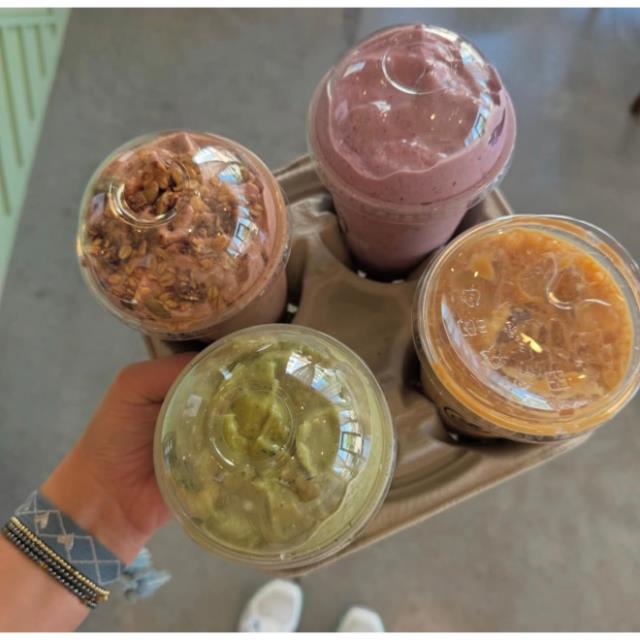 CONTIENE: FRESA, CREMA DE CACAHUATE, DATIL, VAINILLA, COCOA, GRANOLA DE LA CASA, PROTEINA DE VAINILLA Y LECHE DE SOYA.