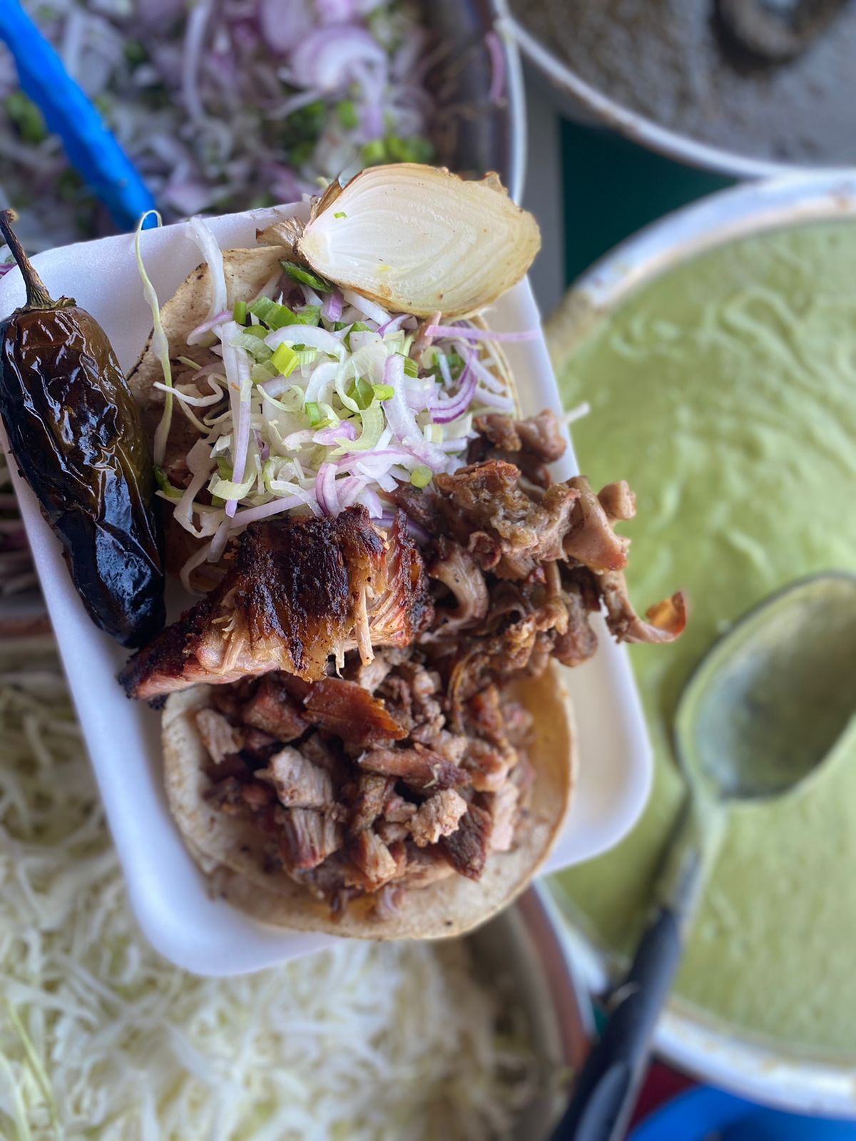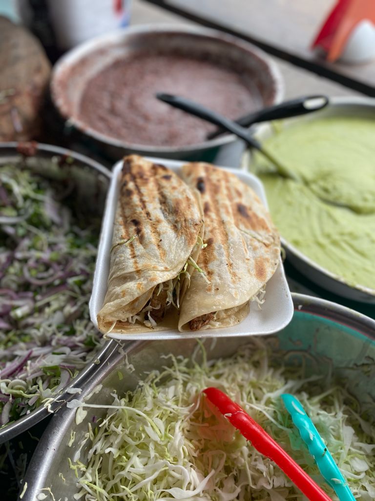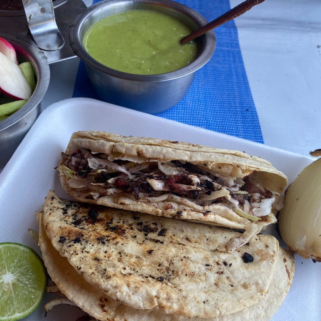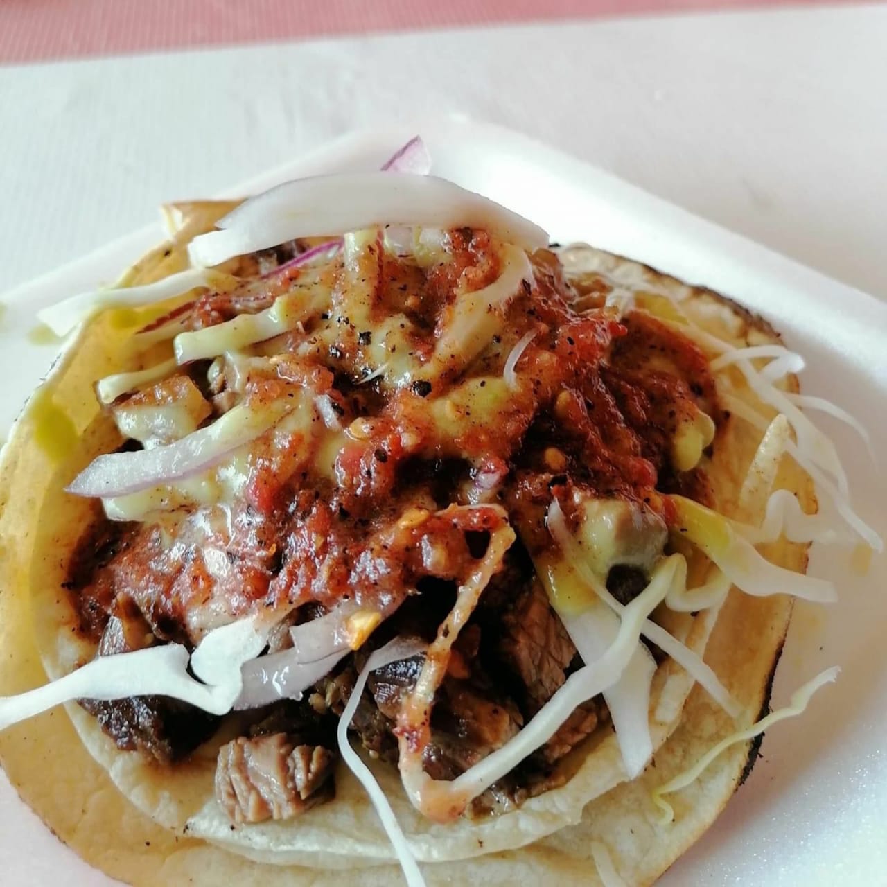 Taco de tortilla harina con doble tortilla. Con repollo cebolla y salsa.