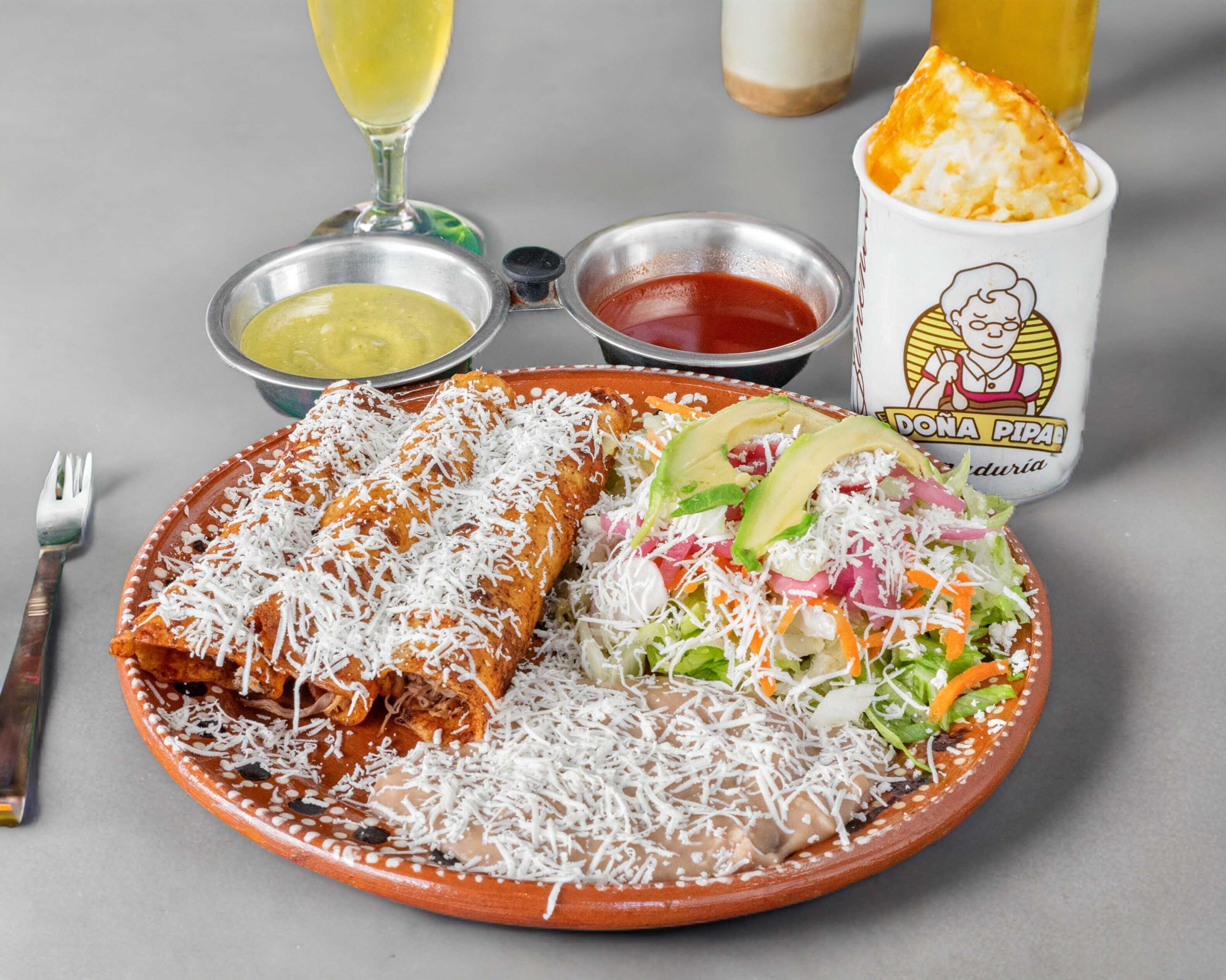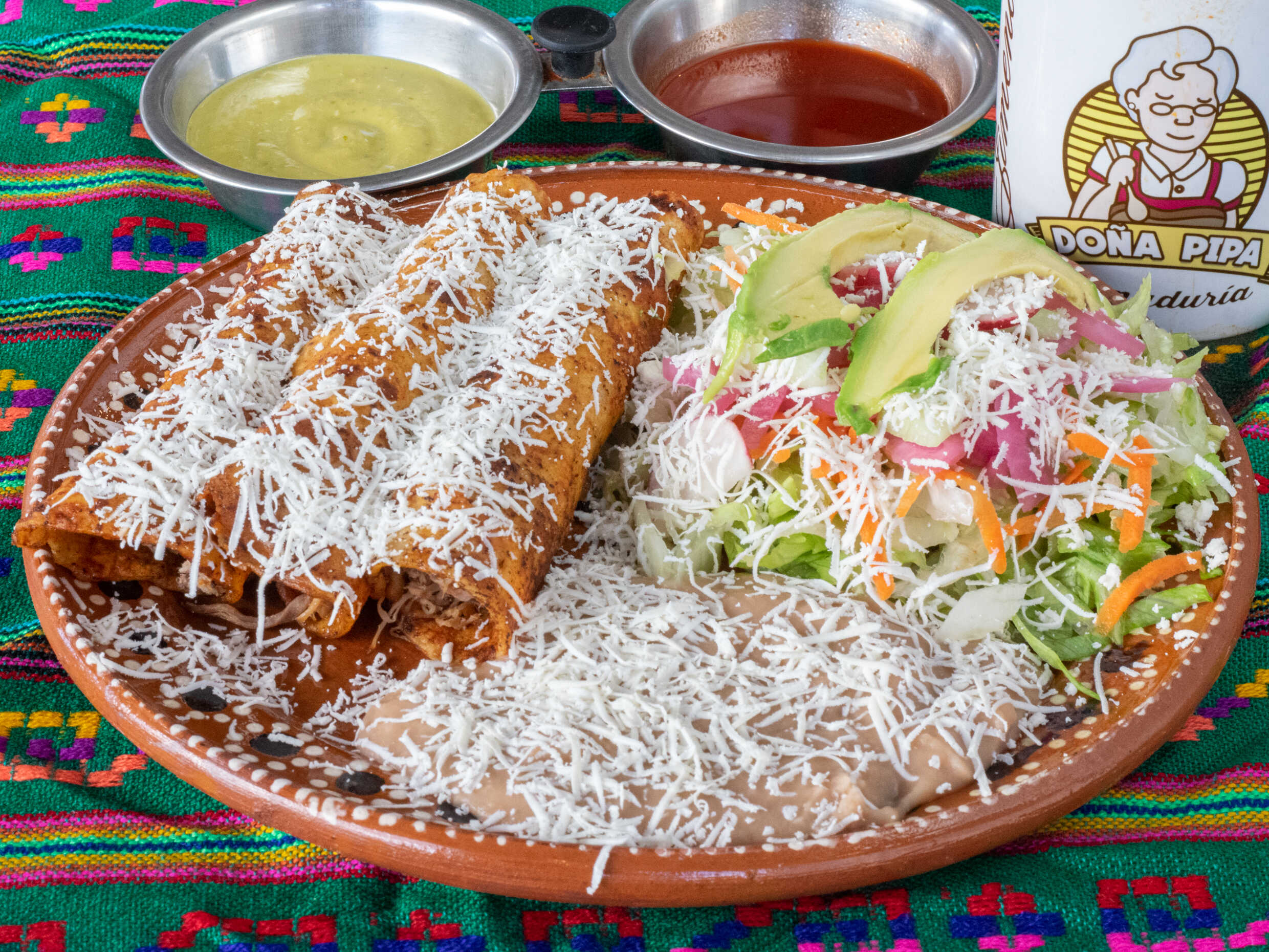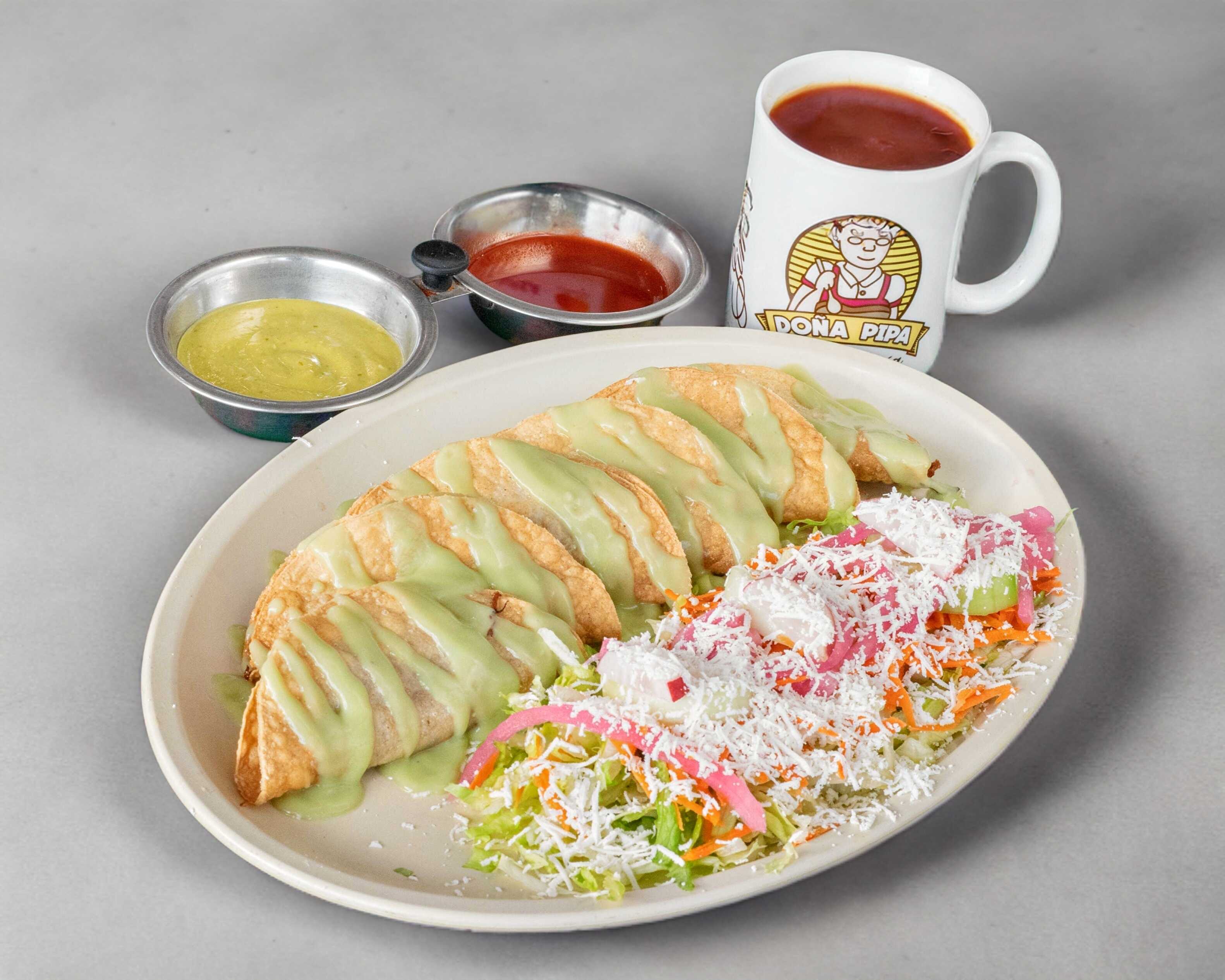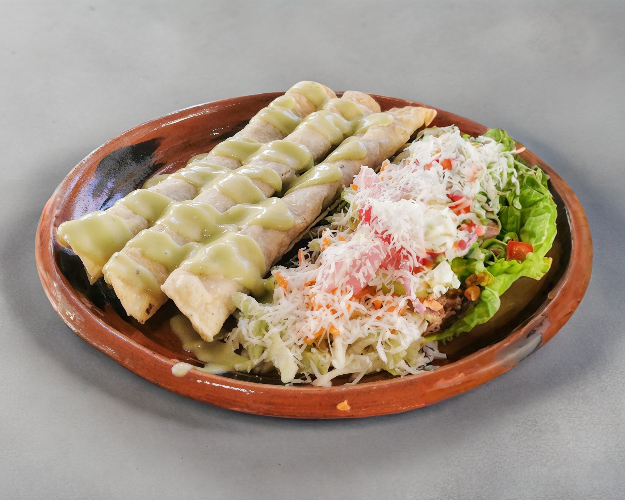 Orden con 3 Pz. Crujientes tortillas alargadas, rellenas de res, pollo, papa o requeson y bañadas con guacamole, acompañadas de verdura y consomé.