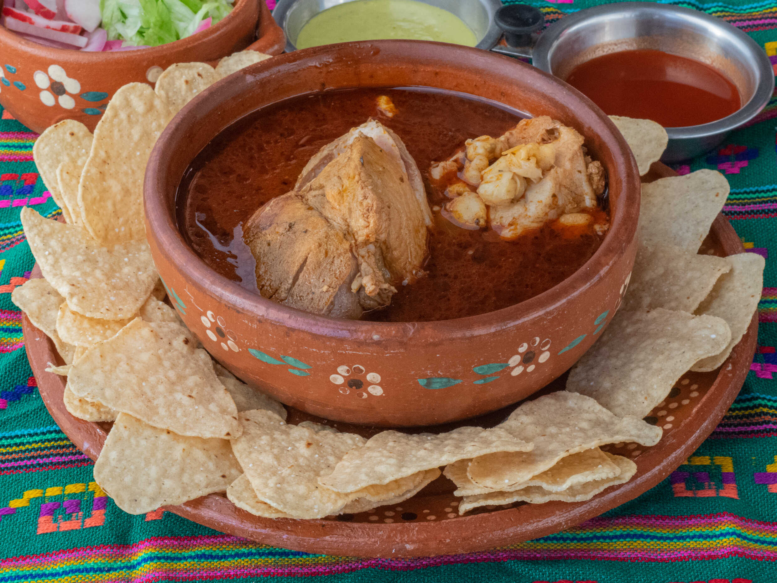 Delicioso pozole rojo de carne de puerco, acompañado de lechuga, cebolla morada y rábanos.