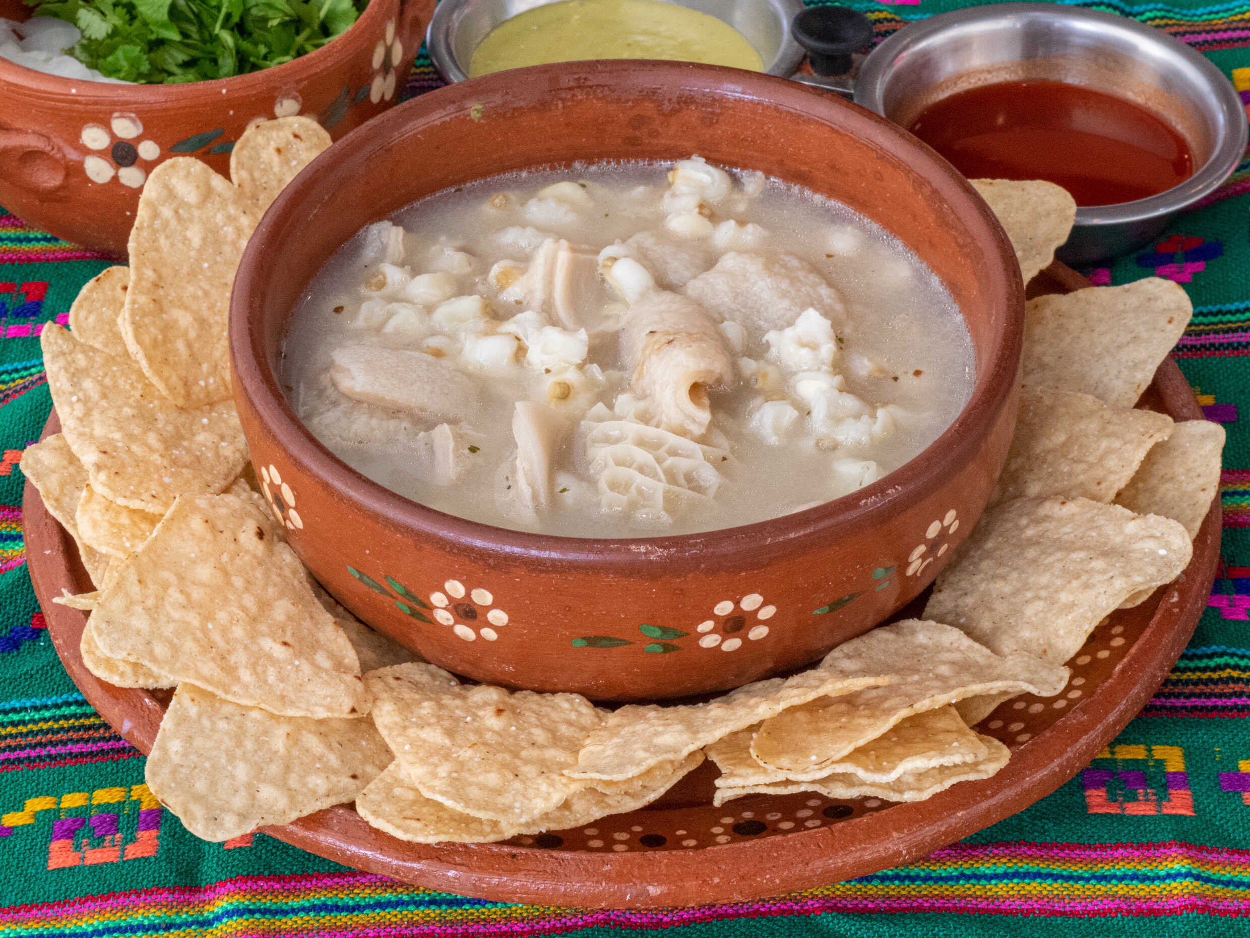 Rico menudo blanco echo con pancita de res y nixtamal, acompañada con cilantro, cebolla blanca, salsa de chile de árbol y totopos