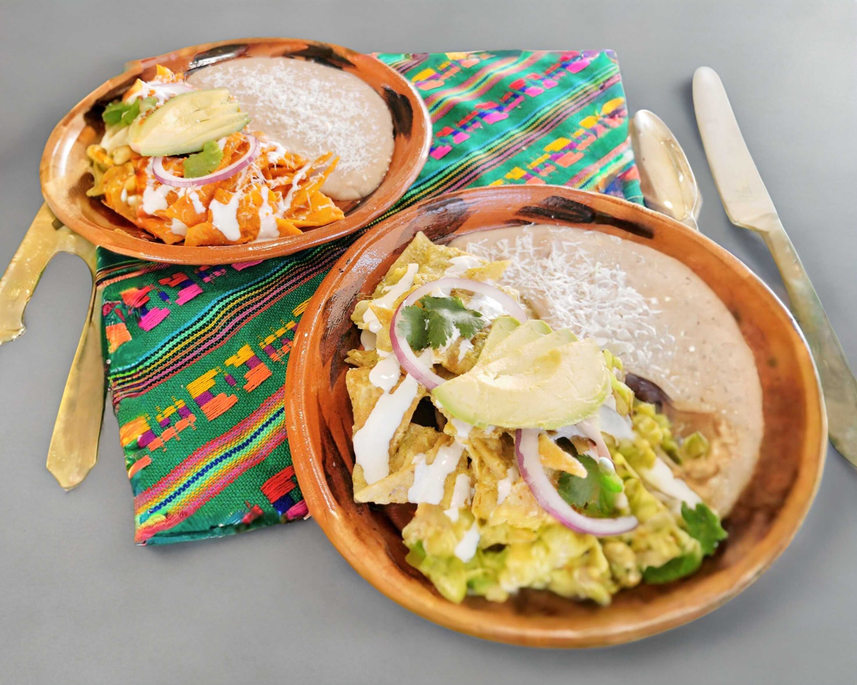 Chilaquiles ( verdes o rojos)Fritura de tortilla de harina de maiz bañada en nuestras salsas y queso chihuahua coronados con aguacate, acompañados de frijol (100 gramos ) con queso.