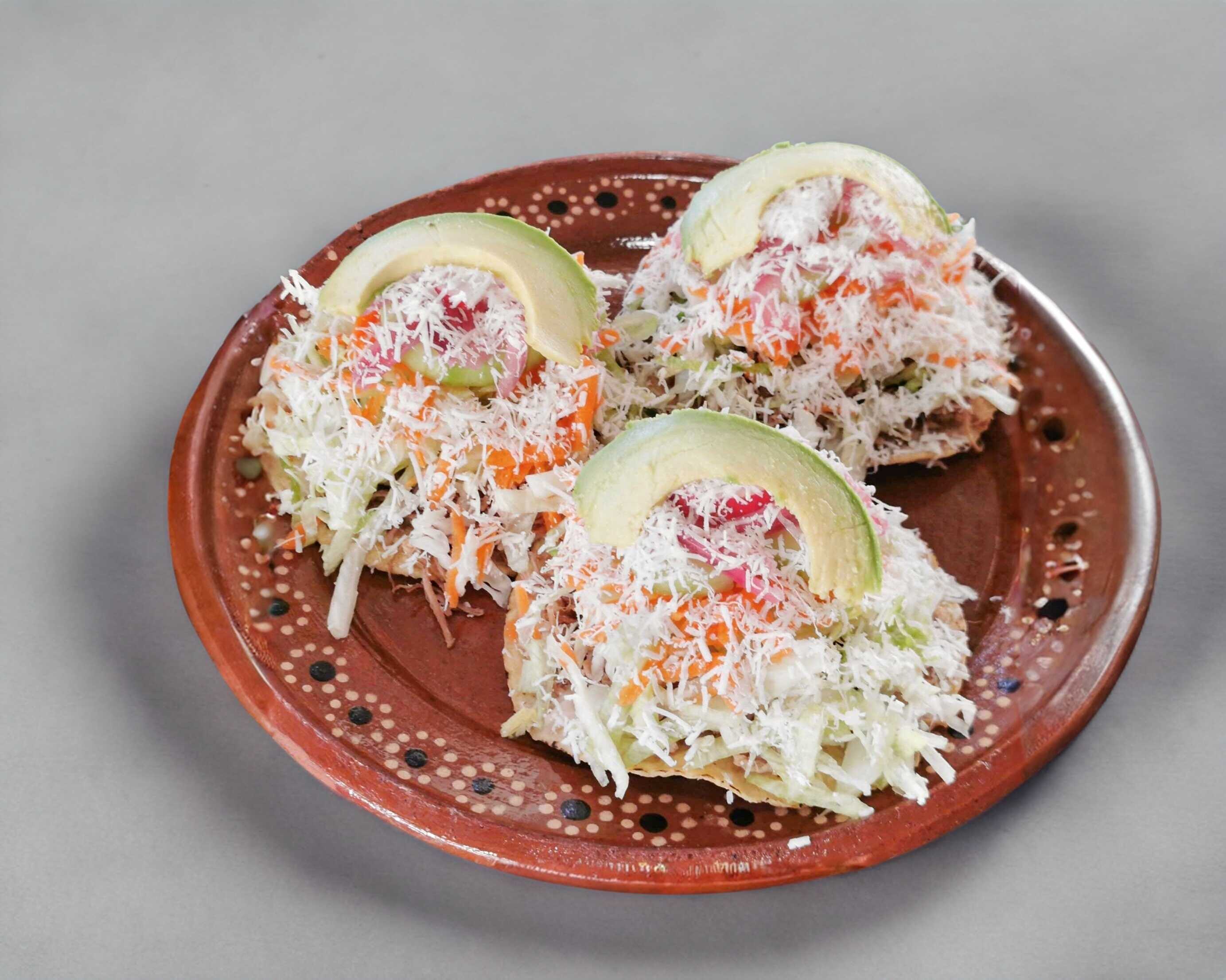 Orden con 3Pz. Masita de maíz frita, untada con frijol, montada con res, pollo o requeson y verdura acompañada de consomé de res..