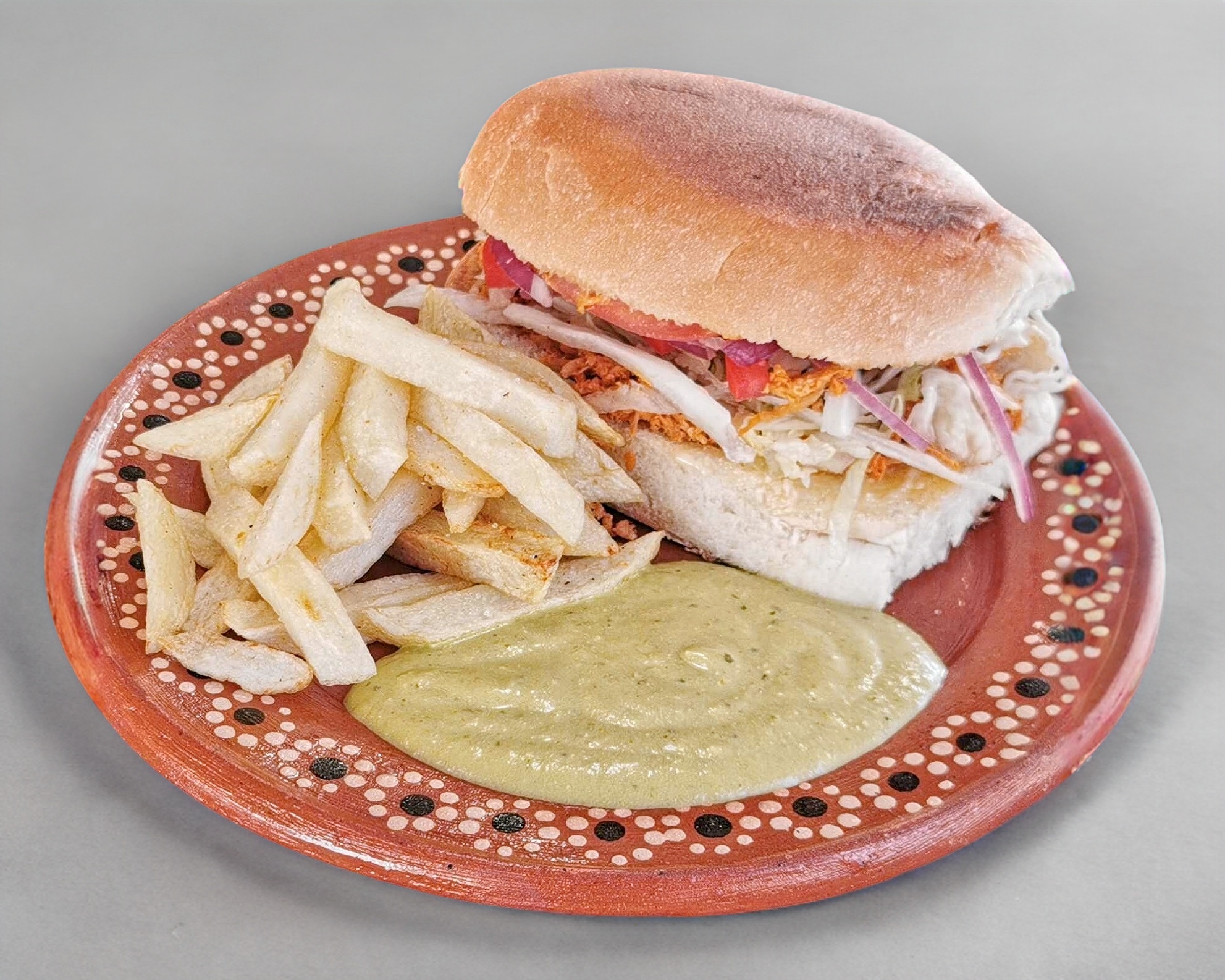 Pan dorado con mantequilla, relleno de cochinita, lechuga, tomate cebolla, jamón y queso, acompañada con nuestra salsa de jalapeño. También incluye una orden de papas.