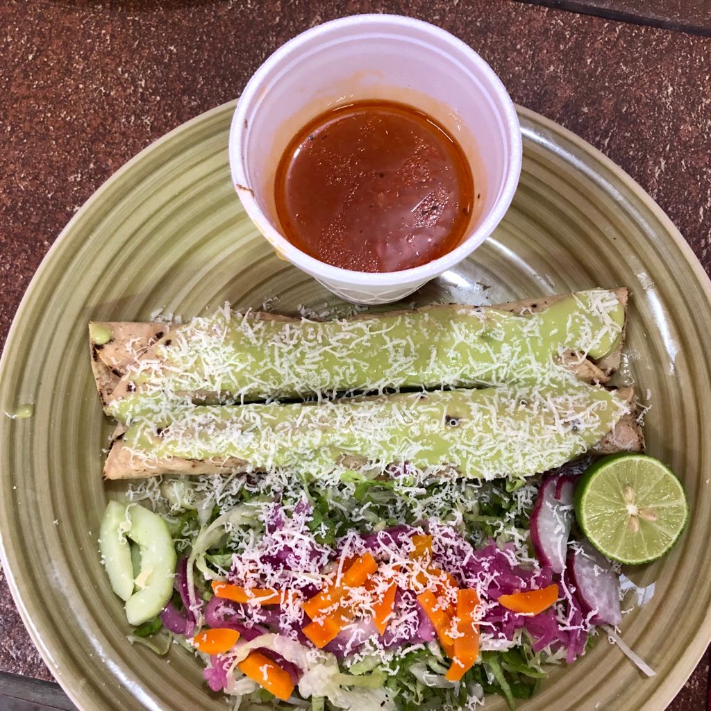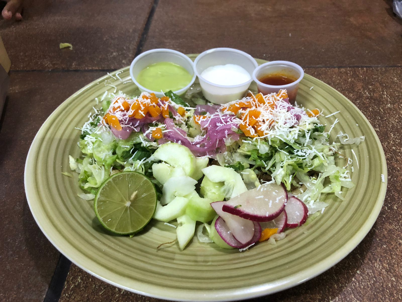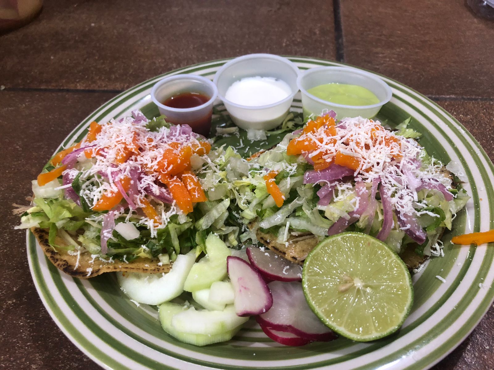Acompañadas de lechuga, cebolla curtida, zanahoria, queso, guacamole, rábano y pepino.