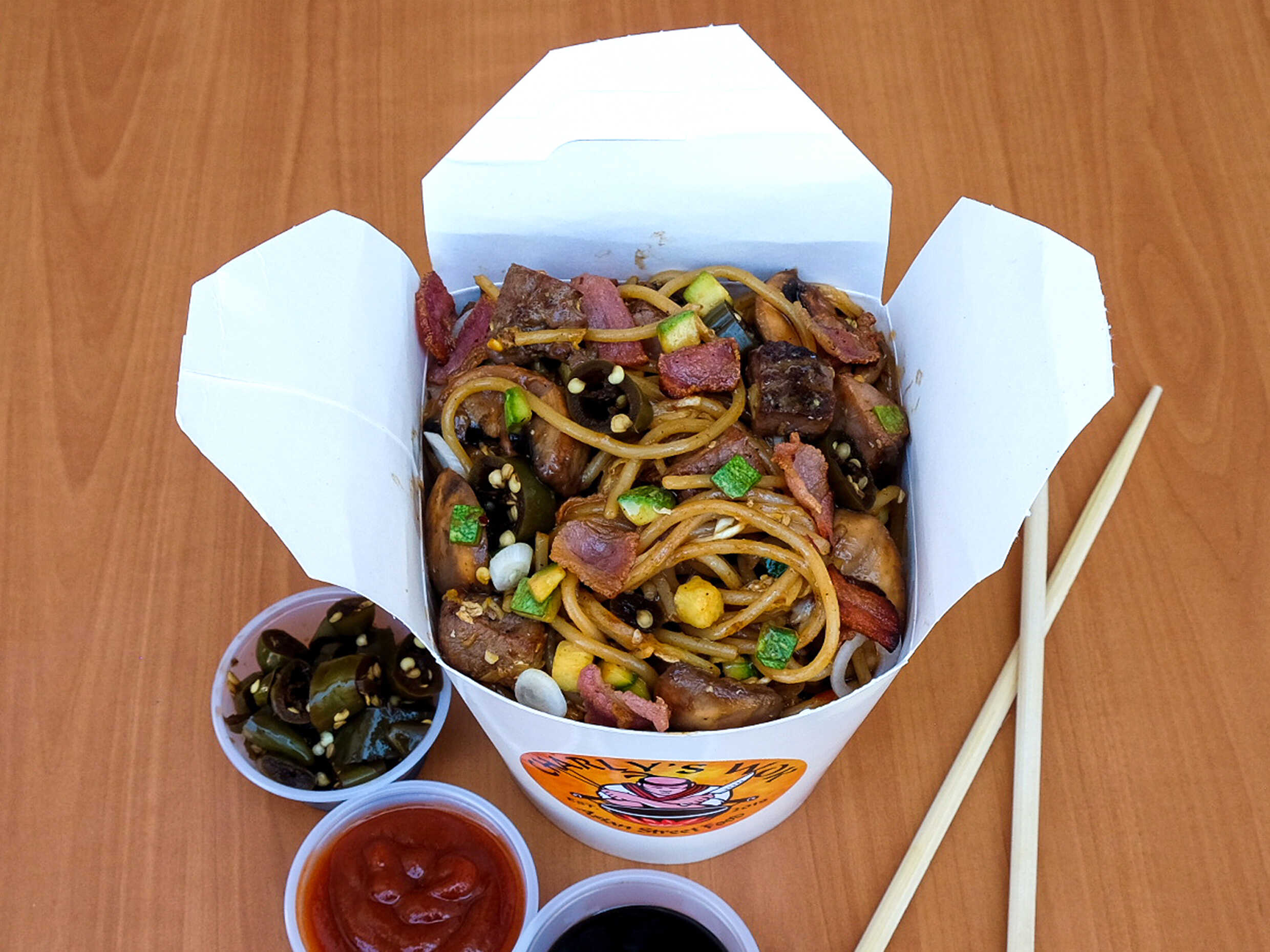 Base de Noodles con Arrachera, cebolla cambray, champiñones y calabaza en salsa teriyaki con vietnamita picante y chiles toreados.