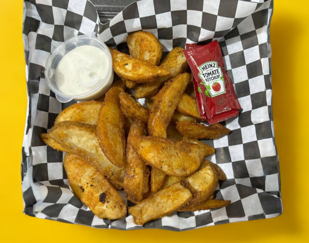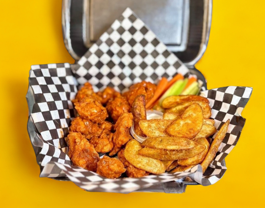 Acompañado de su porción de alitas de pollo bañado en salsa, 1/4 de papas de su elección gajo o francesa, una porción de vegetales y aderezo ranch.