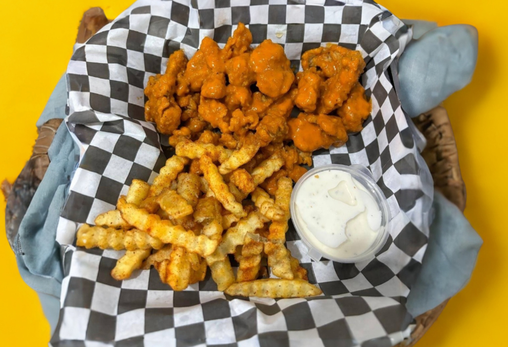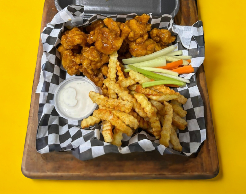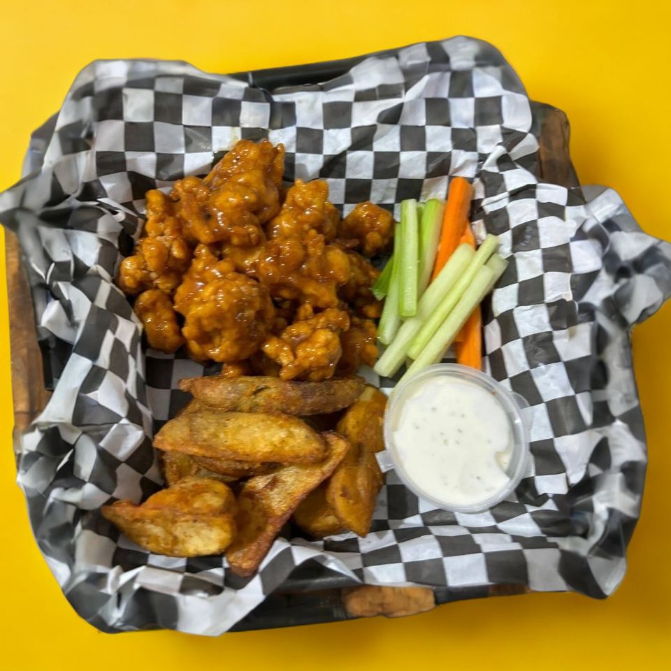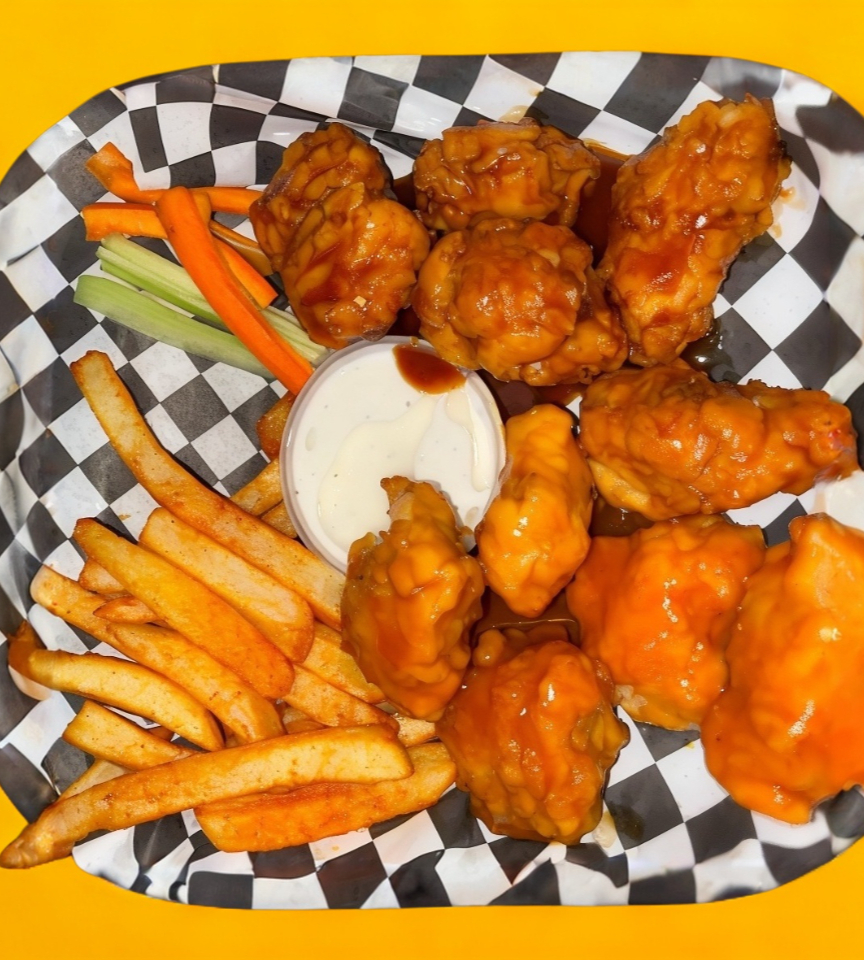 10 Pzas de boneless, 150 gramos de papas de su eleccion, vegetales y ranch