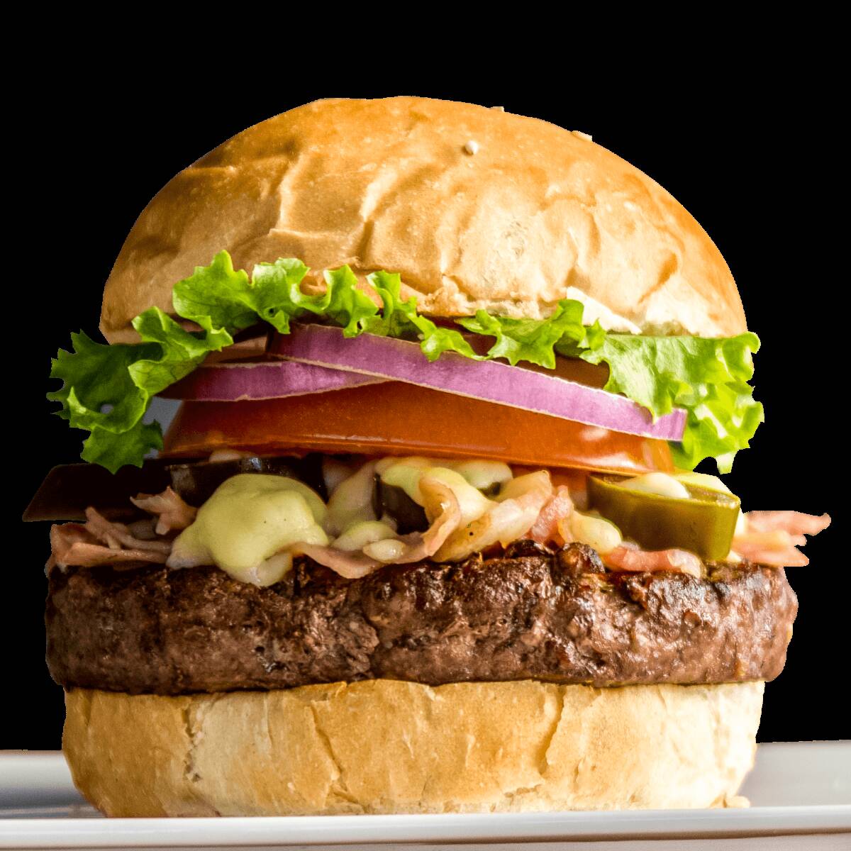 150 Gramos de carne de sirlon, con costra de queso amarillo chihuahua, una base de cebolla y chiles jalapeños guisasos, capa de aguacate, mayonesa y mostaza, acompañado de sus papas ala francesas.