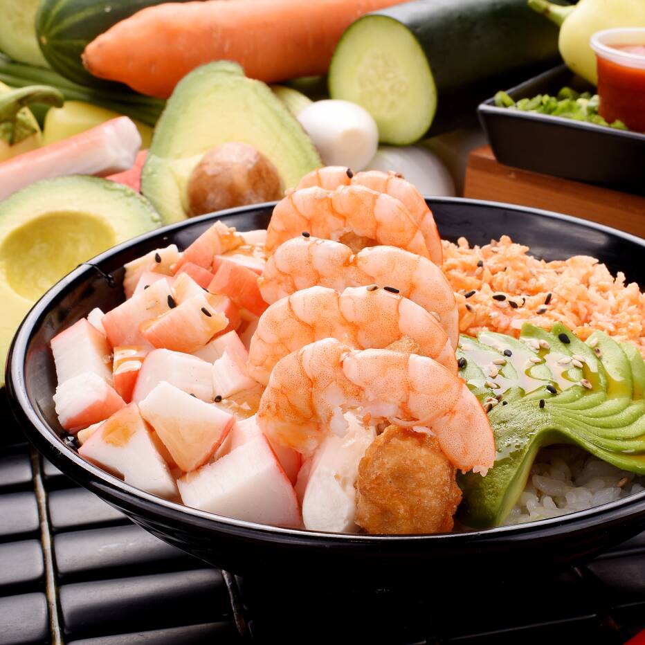 Arroz frito acompañado de ensalada de tampico, Philadelphia, camarón, res, pollo, aguacate, bañado con salsa spicy y ajonjolí.