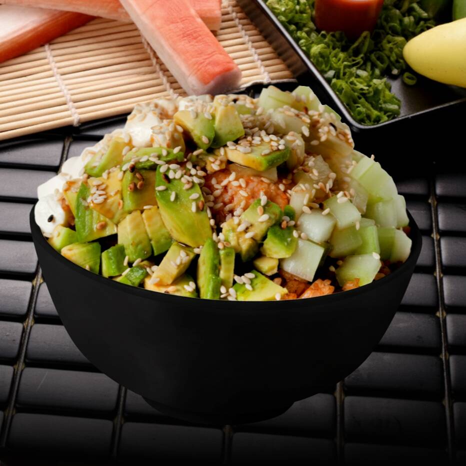 Arroz frito acompañado de ensalada de tampico, Philadelphia, camarón, res, pollo, aguacate, bañado con salsa spicy y ajonjolí.