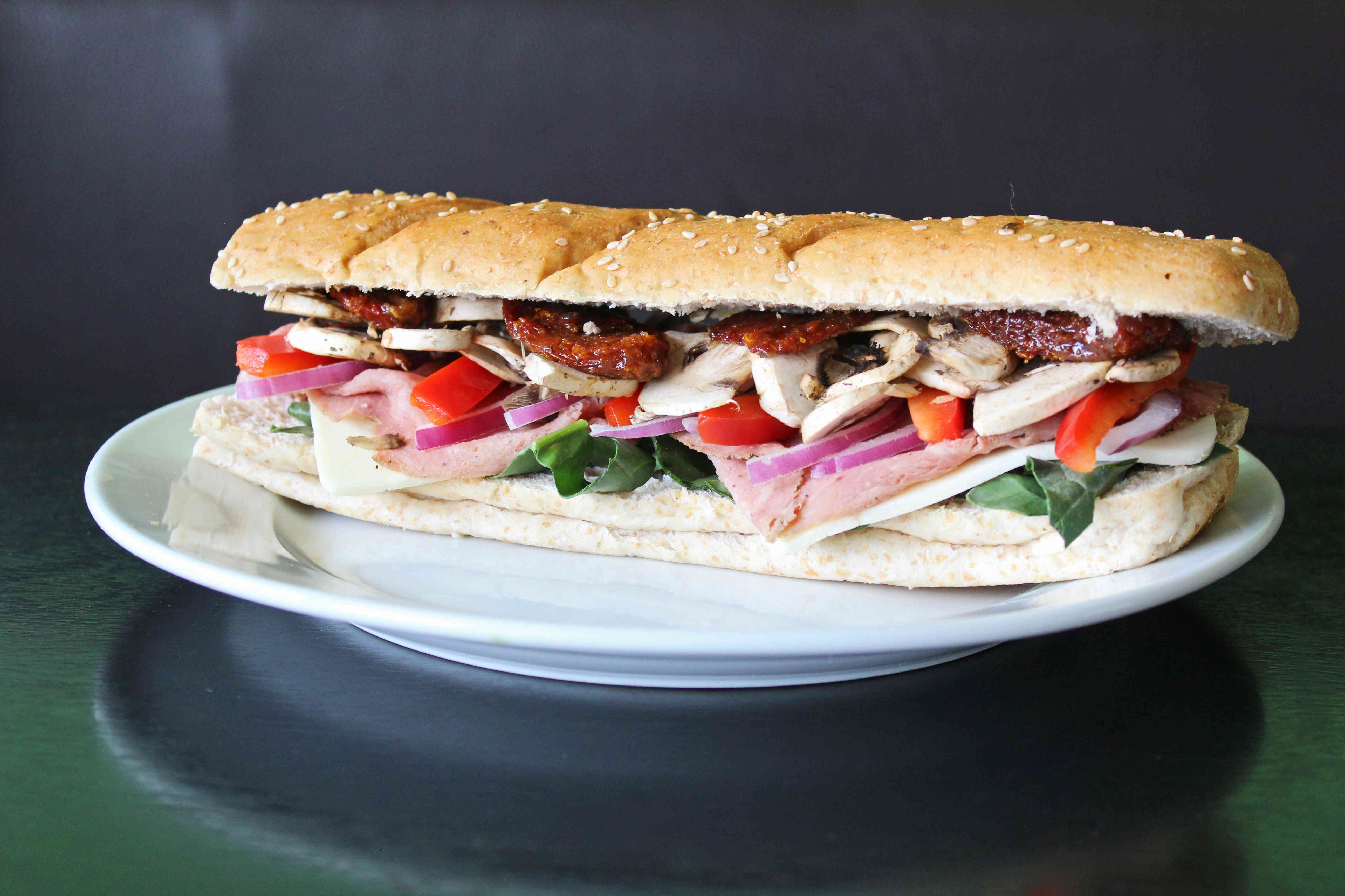 Baguette, pastrami, mozzarella, espinacas, cebolla, pimiento rojo, champiñones, tomates, aderezo chipotle.