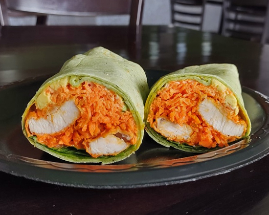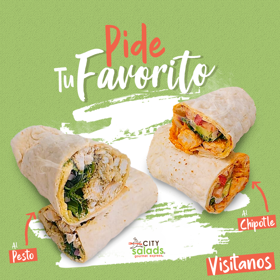 Wrap de pollo natural (250 grs.), pesto, mayonesa, lechuga orejona, espinaca, alfalfa, cebolla morada, aceituna negra, aguacate y aderezo ranch.