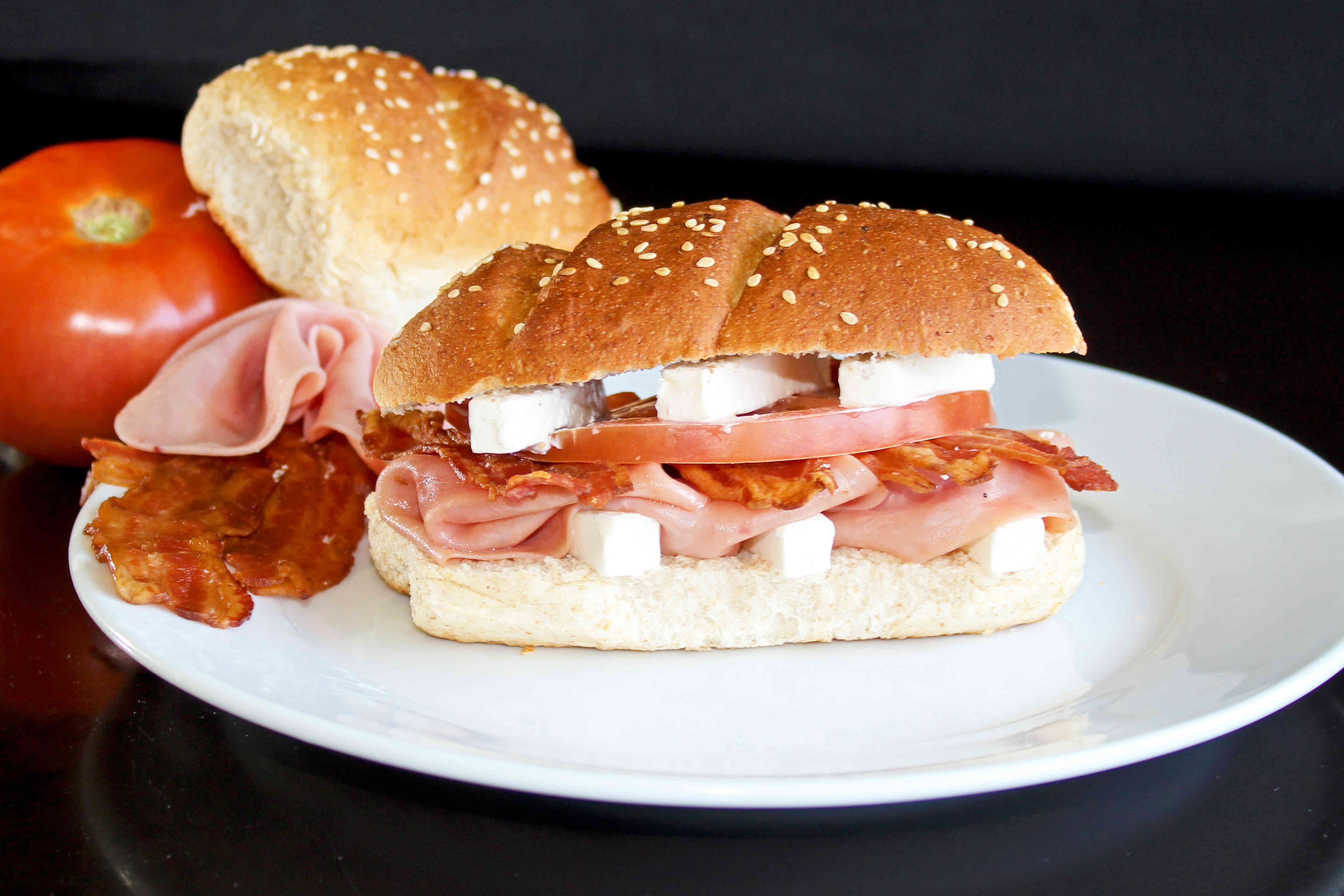 Mini Baguette con tocino, jamón, tomate, queso crema y aderezo.
