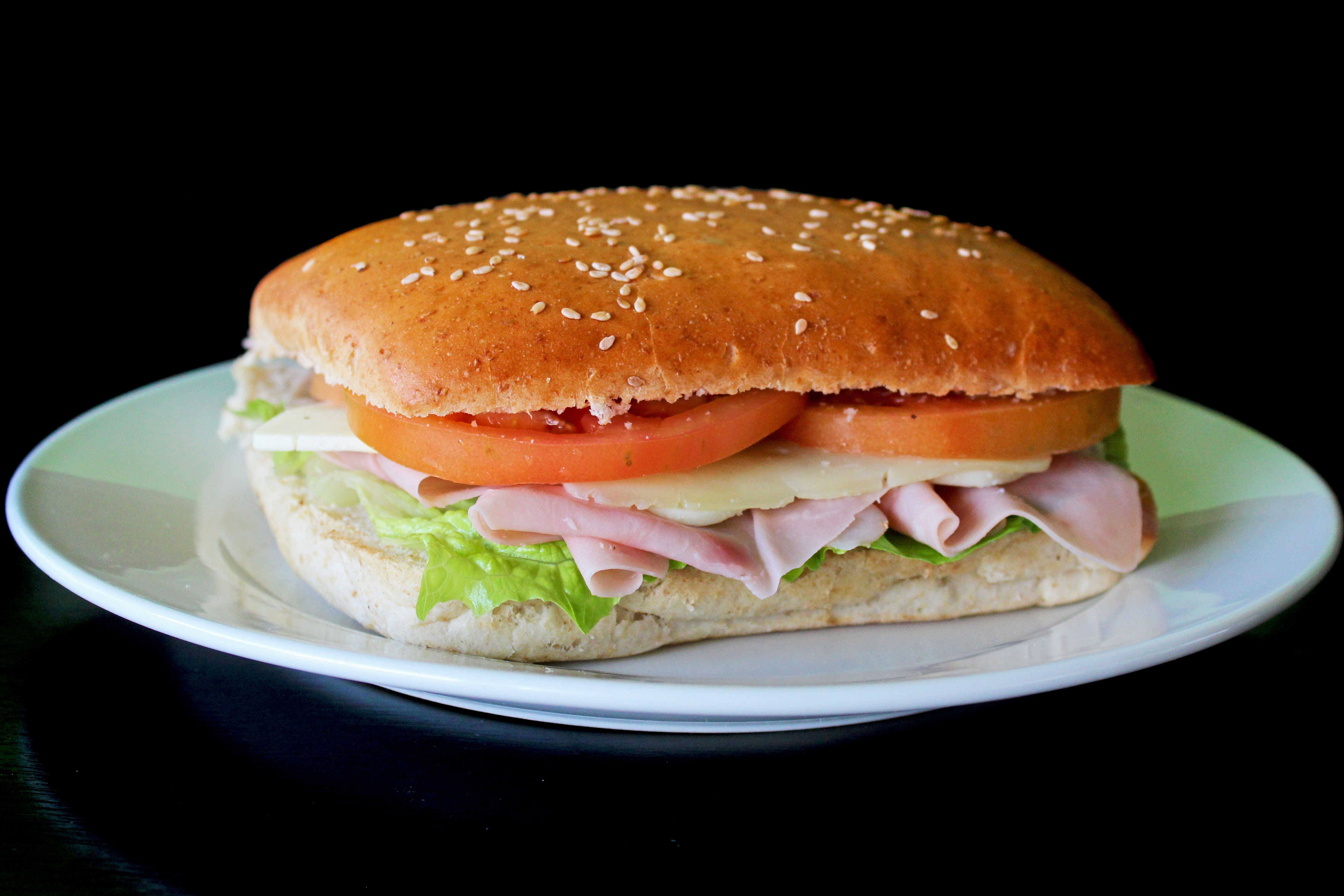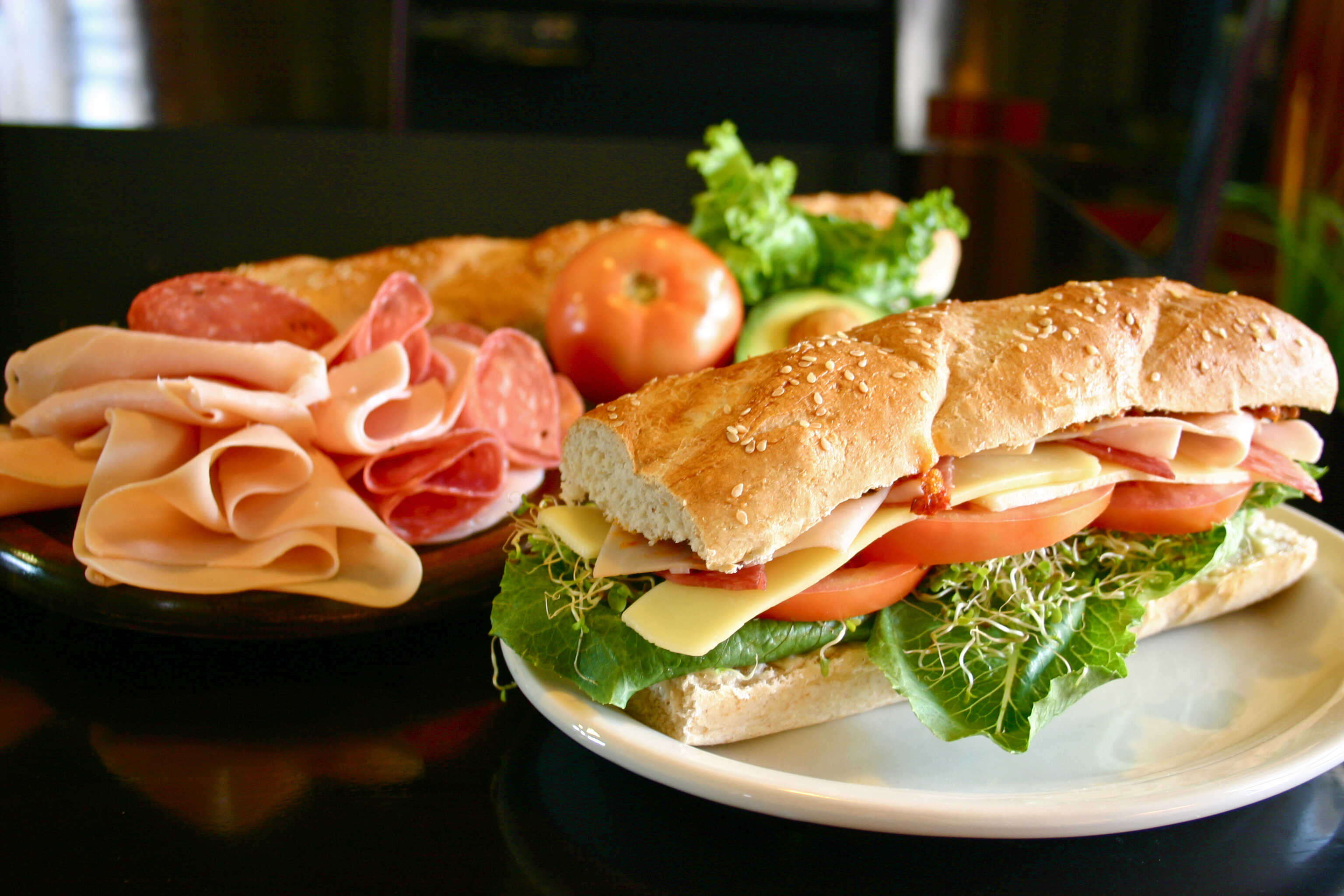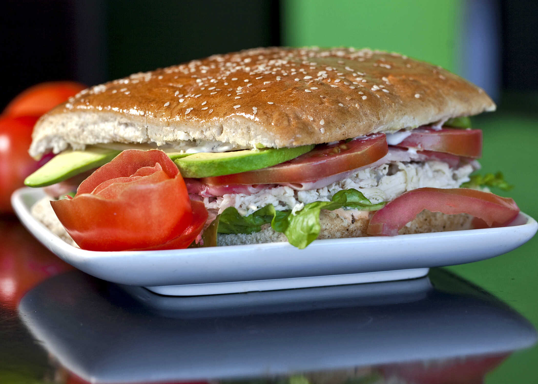Sándwich con jamón de pavo, queso mozzarella, lechuga, tomate, alfalfa y aderezo chipotle.
