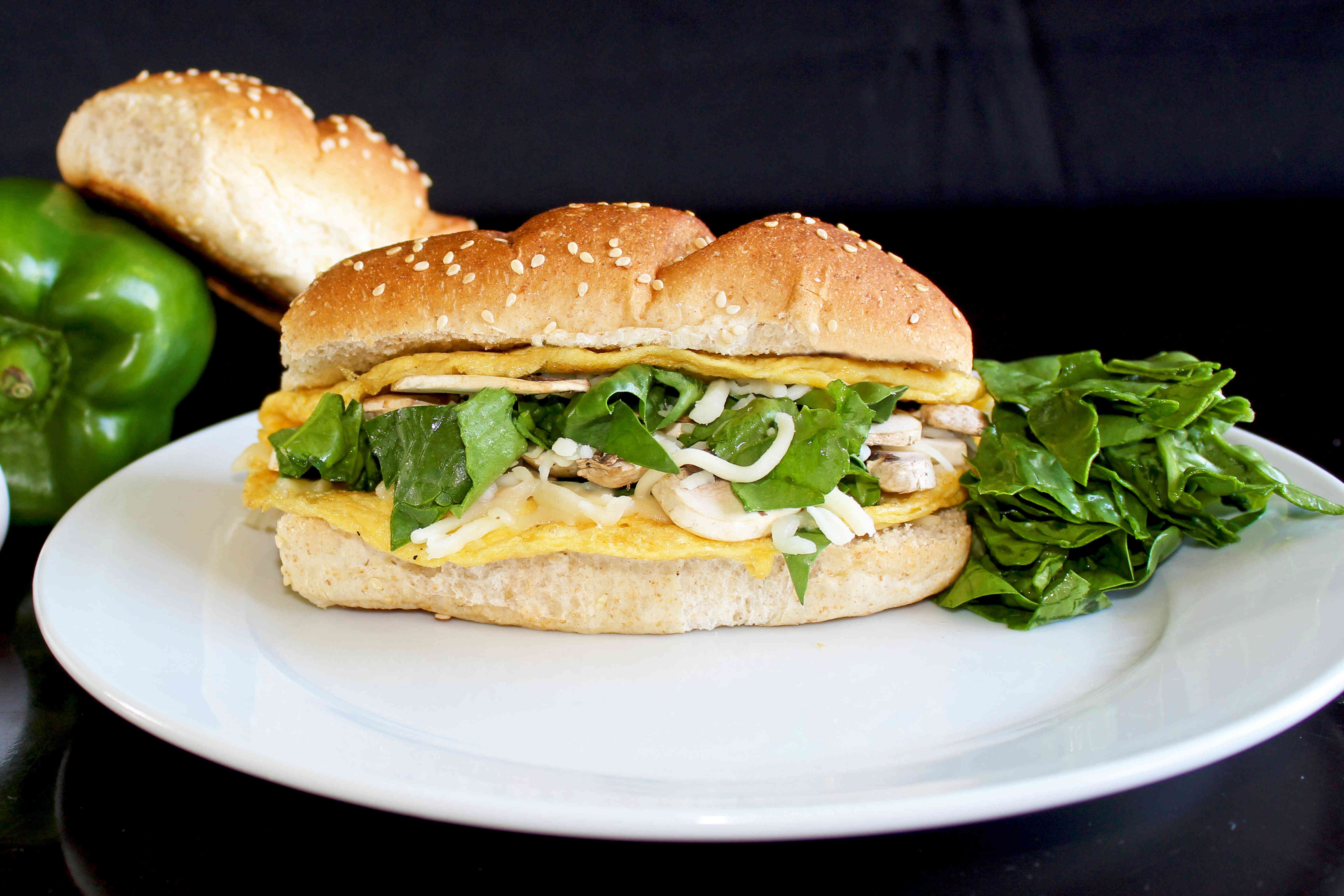 Mini Baguette con omelette, champiñones, espinacas, queso mozzarella y aderezo.