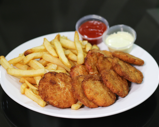 Nuggets de pechuga de pollo empanizada, acompañado de papas fritas.