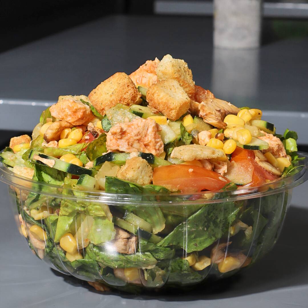 Cama de lechuga + 2 porciones de pollo + 5 ingredientes barra fría + crouton o fritura + queso parmesano, aderezo y ajonjolí.