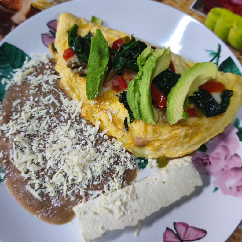 Omelette con queso Oaxaca o panela, espinacas y champiñones acompañado de frijoles