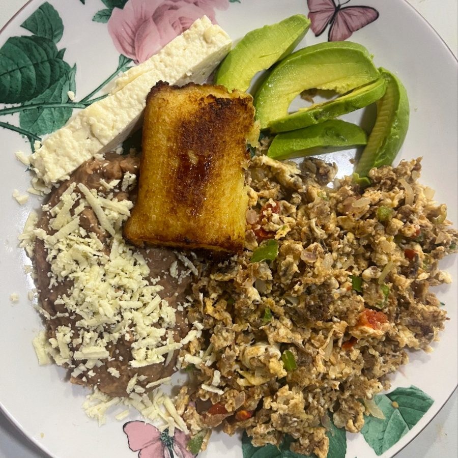 Machaca a la Mexicana con papas, acompañado de frijoles, aguacate y queso panela