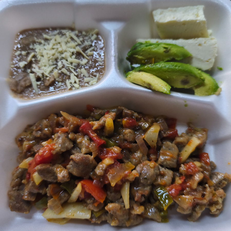 Carne de res a la mexicana con papas acompañado de frijoles, aguacate y queso panela
