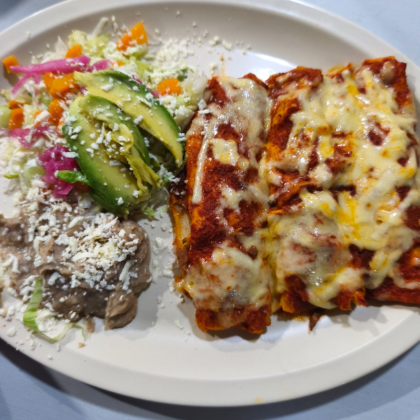 Enchiladas al gusto (pollo o carne) Suizas o queso rayado, acompañadas de verdura y frijoles