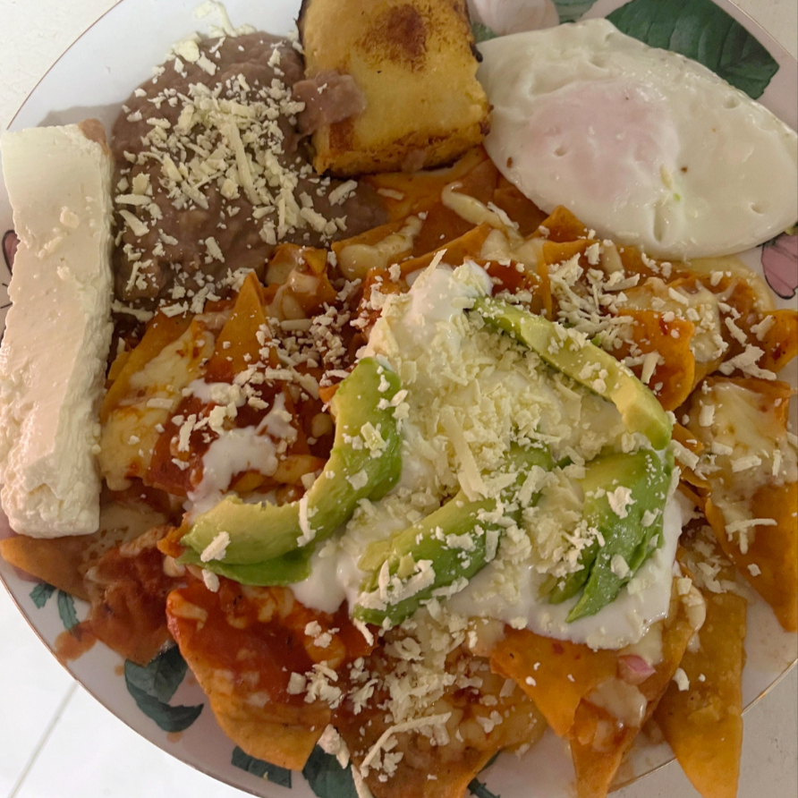 Rojos / Verdes con crema, queso rayado, cebolla morada y aguacate acompañados con un huevo, tamal de elote frito y frijoles